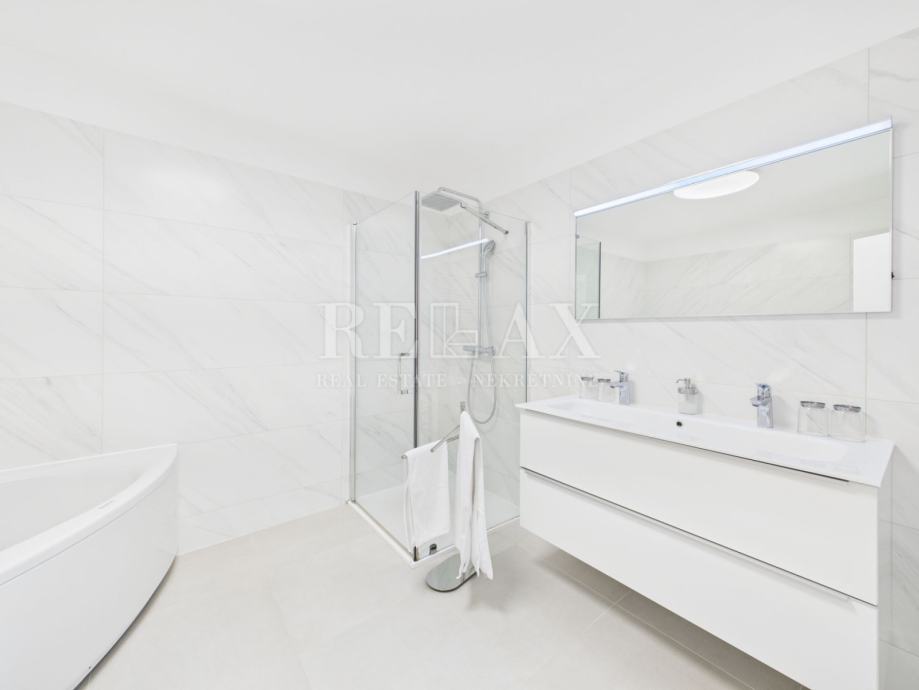 Prizemlje nudi funkcionalan raspored koji uključuje dvije spavaće sobe, kupaonicu, dnevni boravak povezan s kuhinjom i blagovaonicom, hodnik, dodatni toalet, kotlovnicu i praonicu, s izlazom na terasu s grijanim bazenom. Uz bazen se nalazi i uređeni vrt s mini vanjskom kuhinjom – savršeno mjesto za opuštanje i druženje, uz nezaboravan panoramski pogled na more.