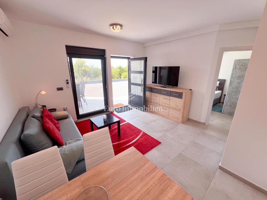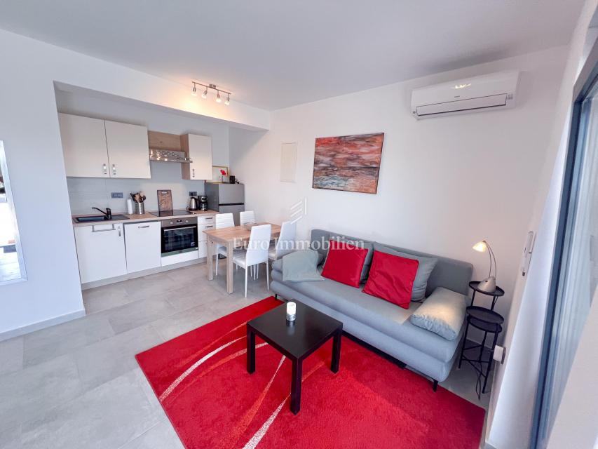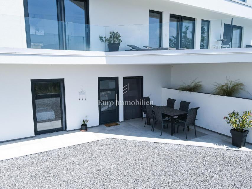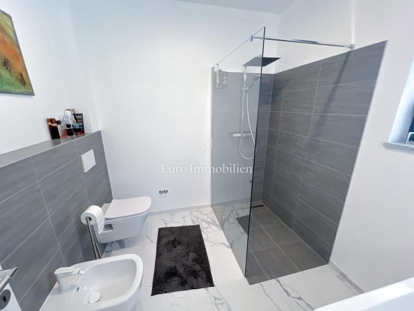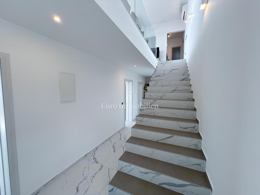 Na srednjoj etaži nalazi se bazen sa slanom vodom i sunčalištem. Kuća je u potpunosti klimatizirana, opremljena toplinskom pumpom za pripremu tople vode, visokokvalitetnom aluminijskom stolarijom s električnim roletama i komarnicima te podnim grijanjem.