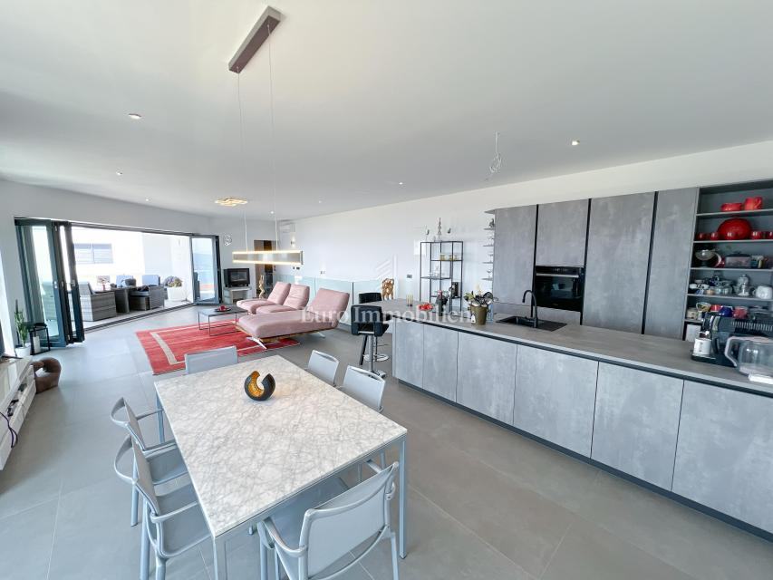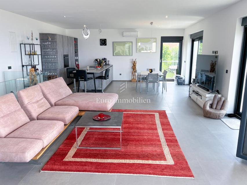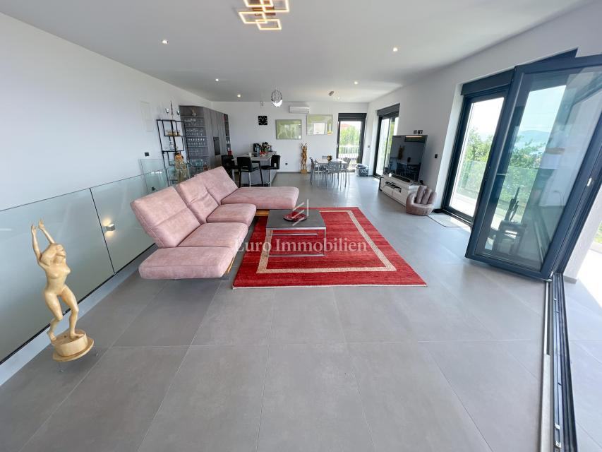 Na uzdignutoj lokaciji u Crikvenici, u mirnom okruženju obiteljskih kuća, prodaje se samostojeća moderna kuća s prekrasnim panoramskim pogledom na more.