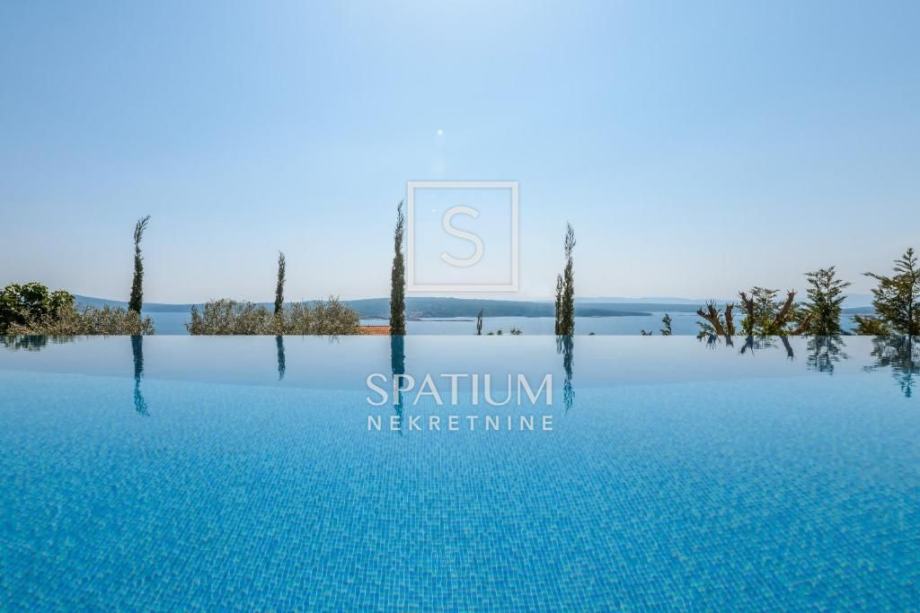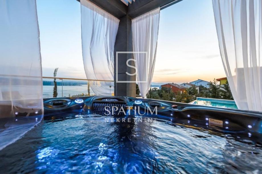 Površina objekta je 300 m2 i sadrži četiri opremljene spavaće sobe svaku sa svojom kupaonicom, prostrani dnevni boravak i moderno opremljenu kuhinju. Velika terasa s koje se pruža panoramski pogled na more i otok Krk ugodna je za druženje, a pruža se sve do lijepog bazena s grijanom i hlađenom vodom okruženog sunčalištem.