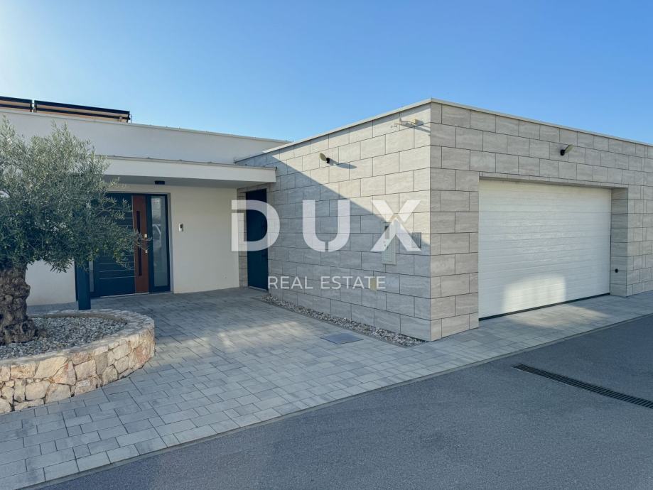 Okućnica od 325 m² uključuje vanjski grijani bazen, sunčalište i natkrivenu terasu, pružajući savršeno mjesto za odmor i uživanje na otvorenom. Dvorište vodi do dodatnog prostora koji sadrži wellness, sanitarni čvor i kotlovnicu. Vanjski dijelovi vile oplemenjeni su prekrasnim hortikulturnim uređenjem, s autohtonim biljkama i drvećem poput maslina, lavande i ružmarina.