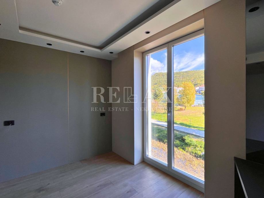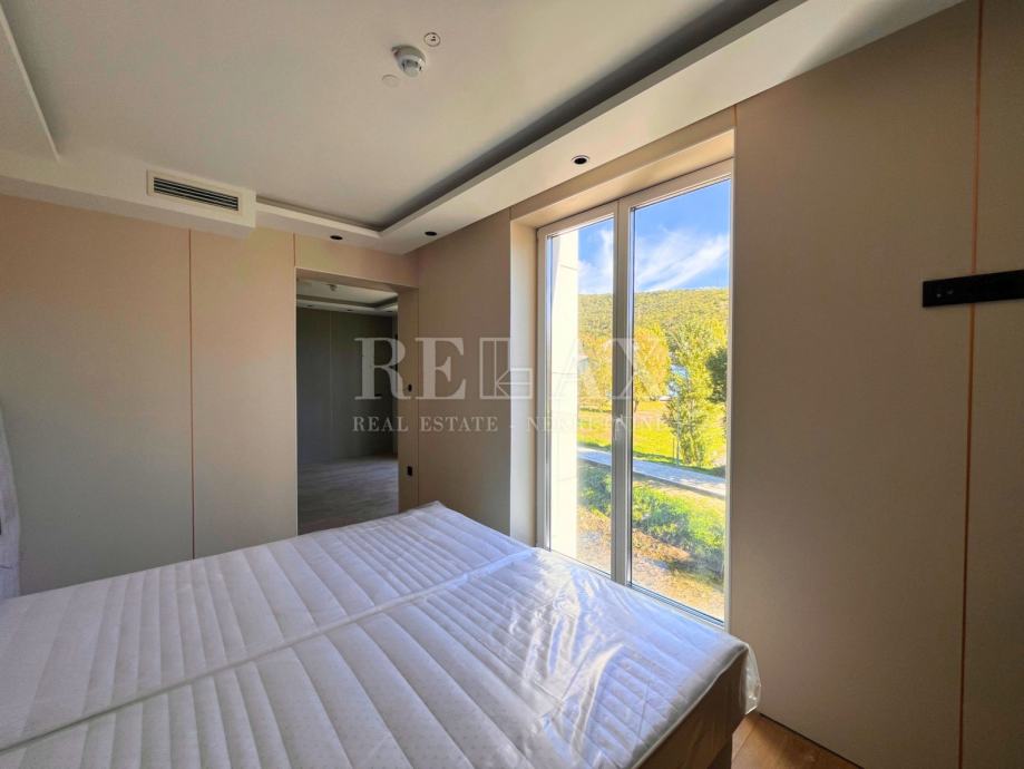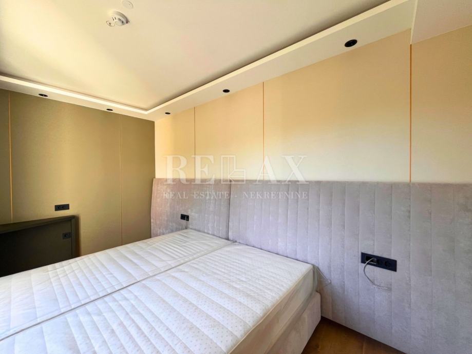 Zidovi su obrađeni dekorativnim perivim premazima, spušteni stropovi skrivaju LED rasvjetu, a električni elementi poput prekidača i utičnica dolaze u sofisticiranoj crnoj izvedbi. Ulazna vrata su protuprovalna, renomiranog proizvođača, što dodatno doprinosi sigurnosti.