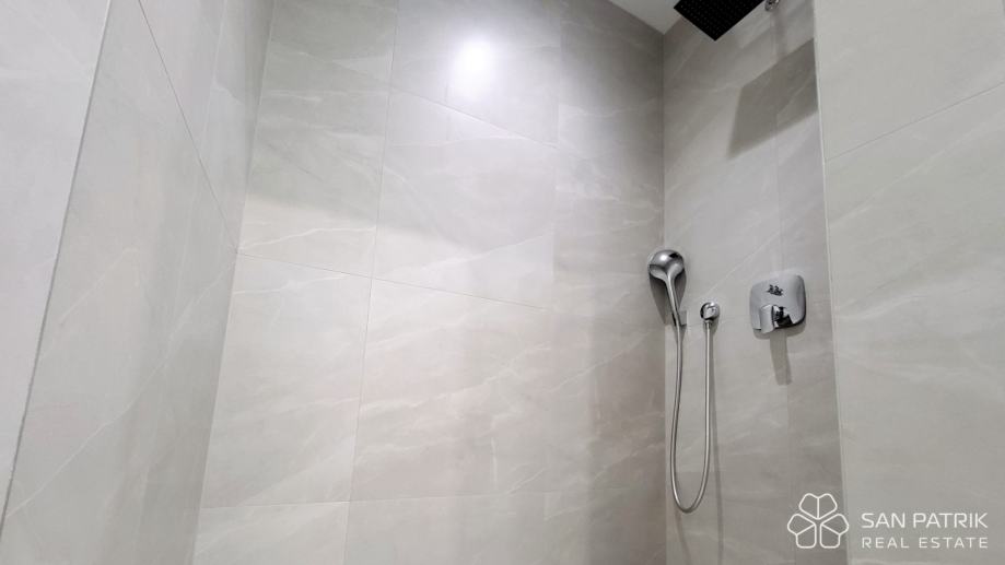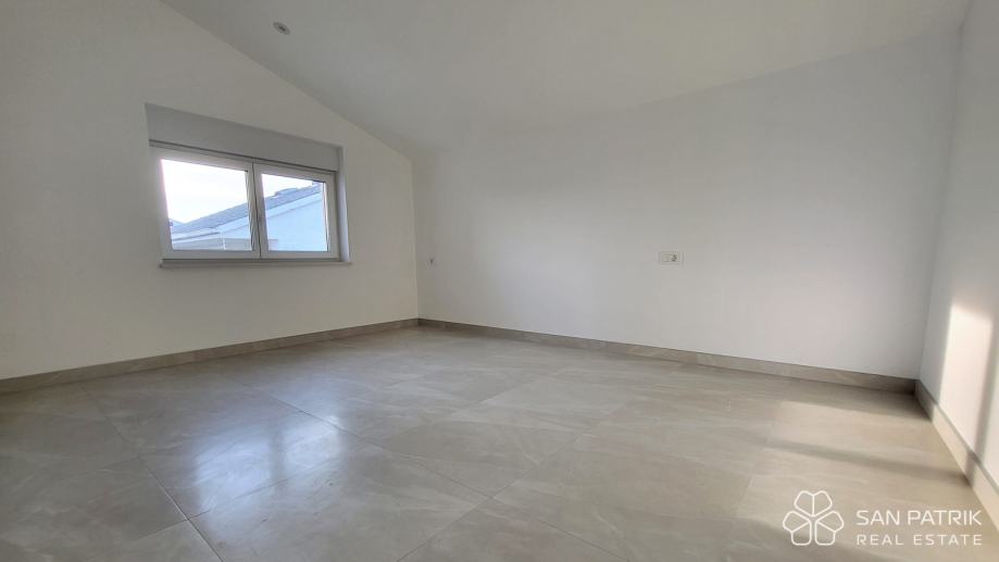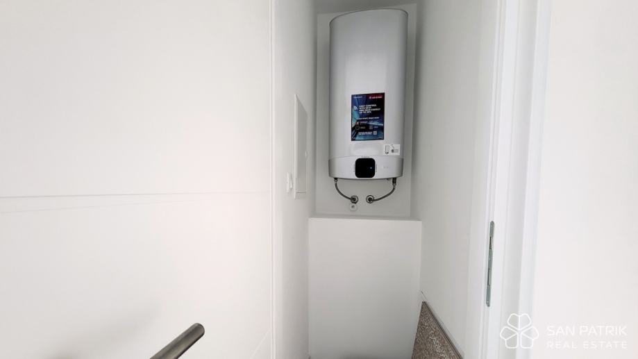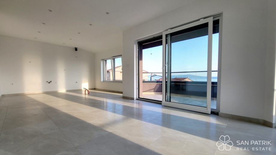 Stan ima ukupnu površinu od 70 m² te uključuje privatno parkirno mjesto. Sastoji se od dvije spavaće sobe, kupaonice i WC-a, spremišta te prostranog dnevnog boravka s kuhinjom i blagovaonicom u otvorenom tlocrtu. Iz dnevnog dijela izlazi se na veliku loggiu s otvorenim pogledom na more. Opremljen je kvalitetnom i suvremenom opremom: podno grijanje u svim prostorijama, klima uređaji, električne rolete, komarnici, video portafon i protuprovalna vrata osiguravaju visoku razinu udobnosti i sigurnosti. Stan je nenamješten, što budućem vlasniku omogućava uređenje prema vlastitim željama.