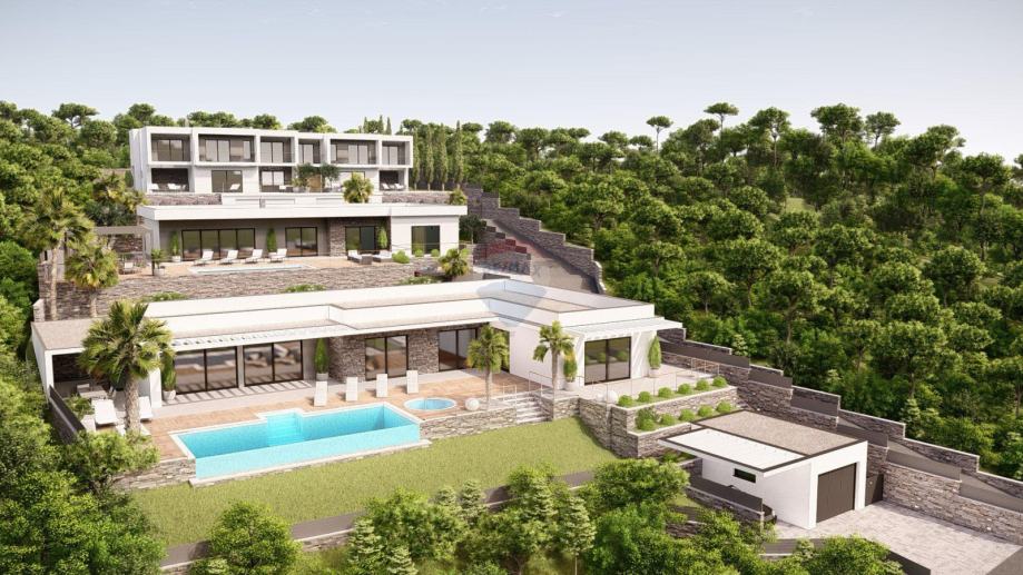 Vila se proteže na tri etaže. U suterenu se nalazi garaža površine 45,5 m², pogodna za dva automobila, kao i kotlovnica. Prizemlje obuhvaća ulazni hodnik, vešeraj, spremište, gostinjski toalet, te prostranu kuhinju s blagovaonicom koja se prirodno nastavlja na dnevni boravak. Iz dnevnog prostora izlazi se na veliku terasu s koje se pruža očaravajući pogled, a na kojoj su smješteni bazen sa sunčalištem, natkrivena ljetna kuhinja s roštiljem i vanjska blagovaonica – idealna za ljetna druženja i opuštanje.