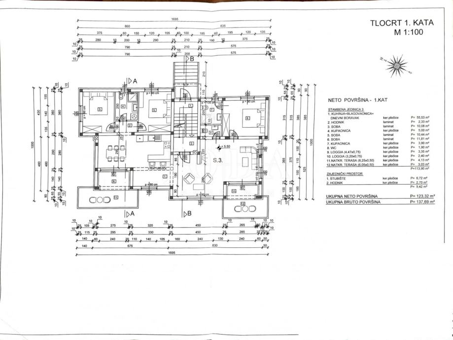 Na 1.i 2. katu su stanovi preko cijele etaže sa tri spavaće sobe, dvije kupaonice, wc-om, kuhinjom i blagavaonicom, dnevnim boravkom i dvije terase.