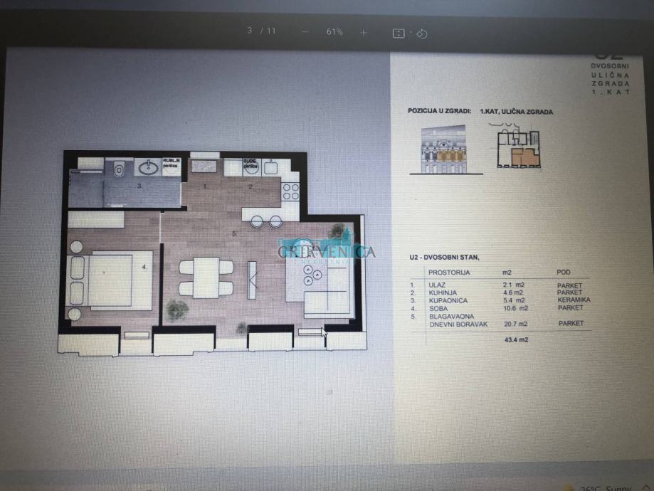 Jednosobni stan sa dnevnim boravkom, na prvom katu novogradnje. Stan se sastoji od ulaznog hodnika, spavaće sobe, kupaonice i kuhinje sa blagovaonicom i dnevnim boravkom. Stan se nalazi u novogradnji u samom centru Crikvenice.