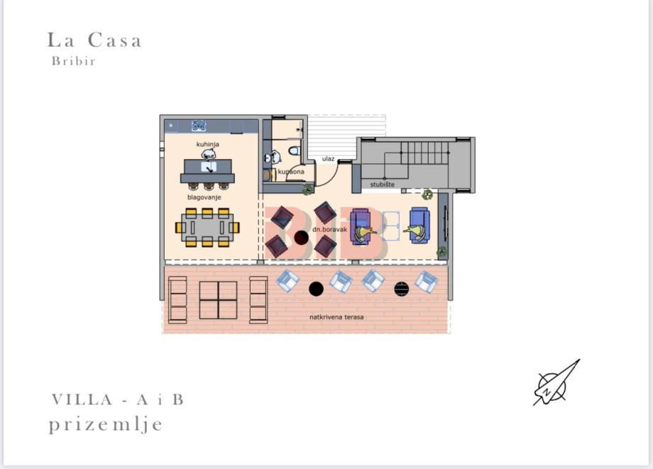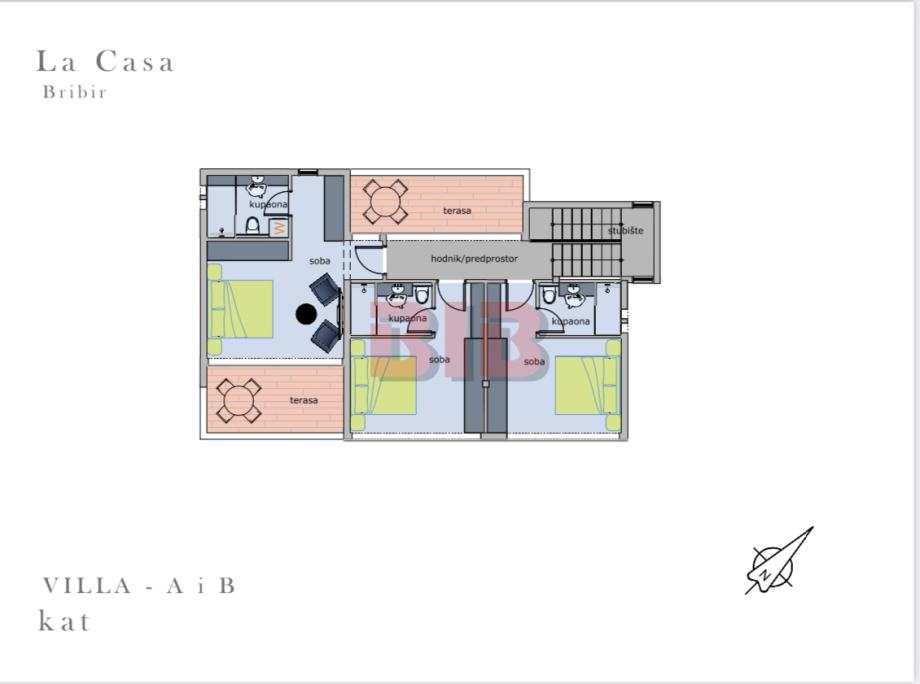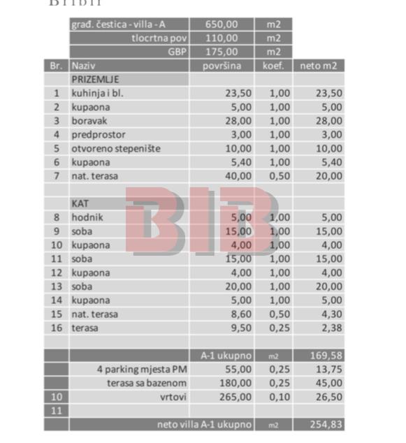 Prizemlje se sastoji od predprostora, dnevnog boravka sa kuhinjom i blagovaonicom,kupaonice,natkrivene terase sa izlazom na sunčalište i bazen,dok je na katu spavaći dio koji se sastoji od 3 spavaće sobe,svaka sa svojom kupaonicom,hodnika i 2 terase od kojih je jedna natkrivena