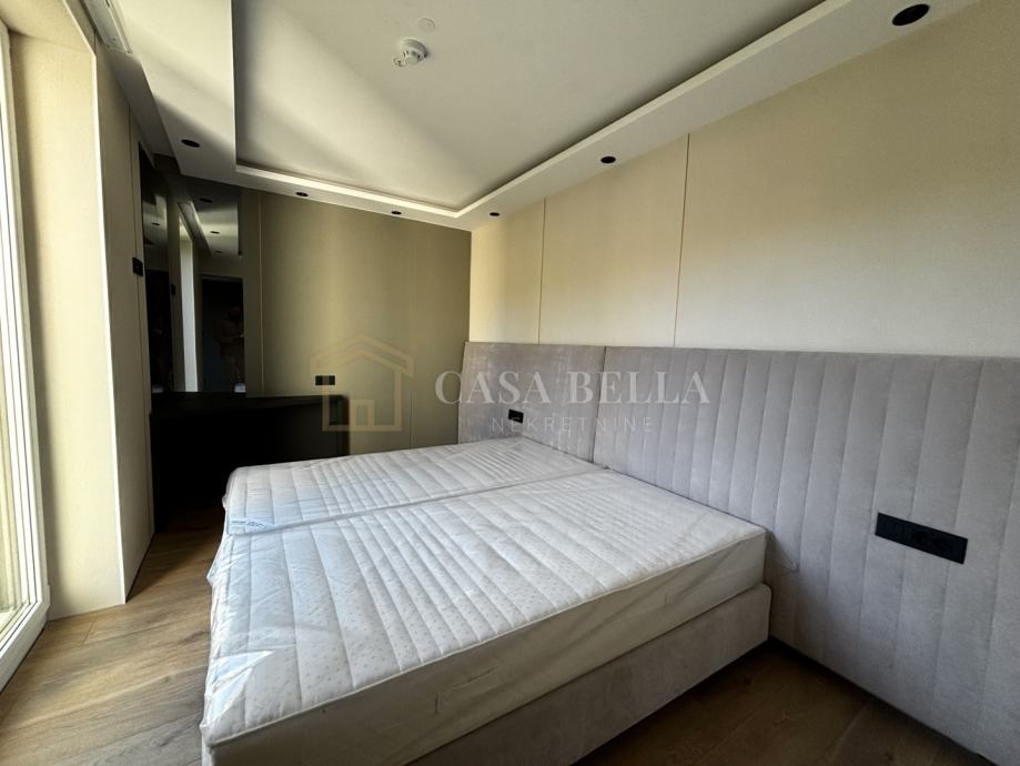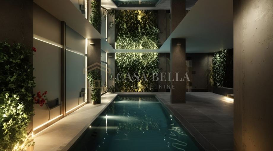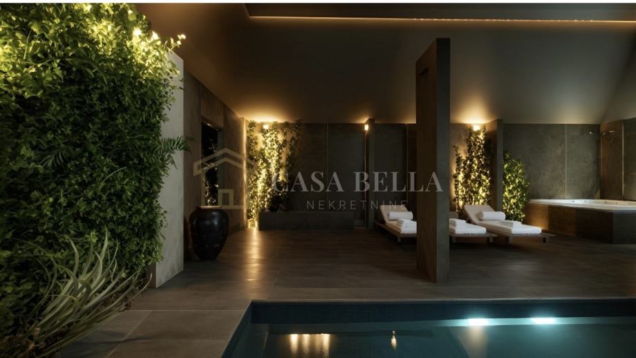 U interijeru su korišteni vrhunski materijali i moderni detalji. Kupaonice su opremljene namještajem od Kerok materijala otpornog na vodu i udarce, keramikom velikog formata (240x120 cm) te slavinama i tuševima u mat bijeloj boji sa zlatnim detaljima. Posebnu eleganciju prostoru daju indirektna rasvjeta, prekidači i utičnice TEM u mat crnoj boji, lakirana unutarnja vrata s magnetskom bravom i skrivenim pantima, te protuprovalna vrata Diere.