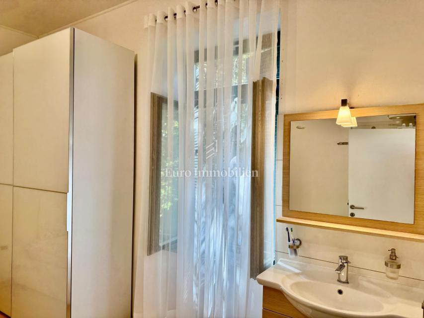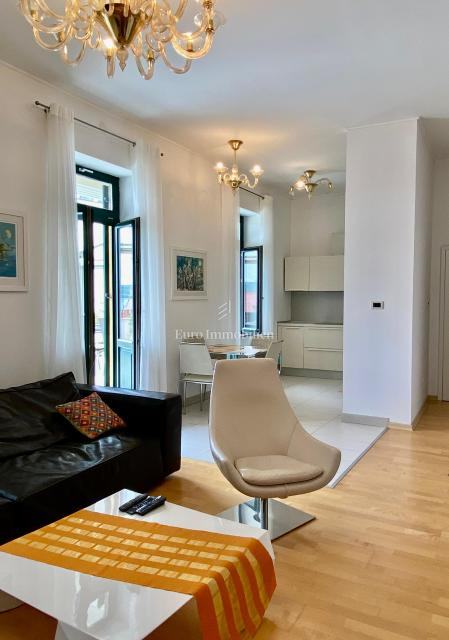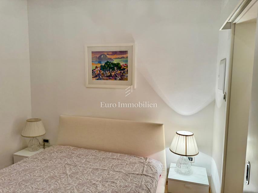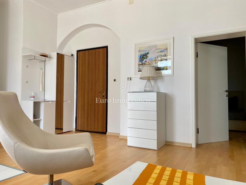 Stan se sastoji od dvije spavaće sobe, svaka s vlastitom kupaonicom, dodatnog wc-a za goste te kuhinje povezane s blagovaonom i dnevnim boravkom. Iz dnevnog dijela izlazi se na natkrivenu terasu od 40 m² s pogledom na more – što je rijetkost na ovako centralnoj lokaciji.