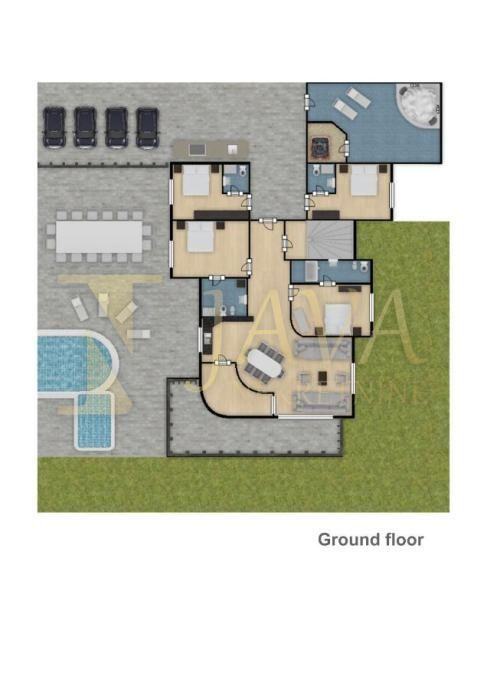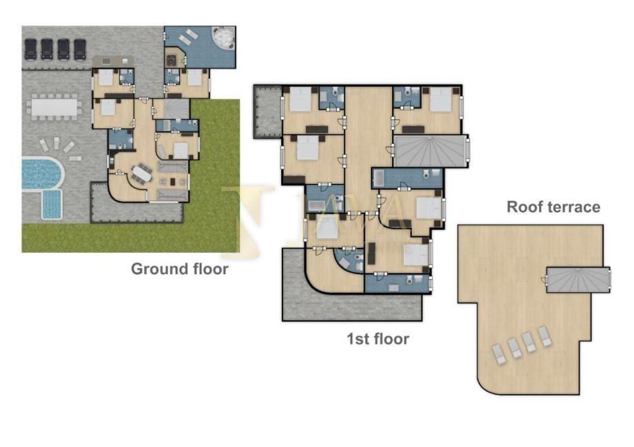 * Prizemlje: prostrani ulazni hodnik i dnevni dio (potpuno opremljena kuhinja, blagovaonica i dnevni boravak) s izlazom na terasu, četiri spavaće sobe s vlastitim kupaonicama