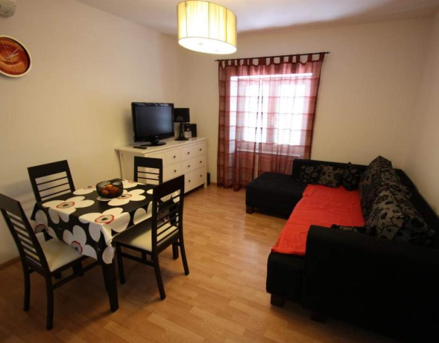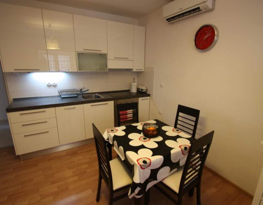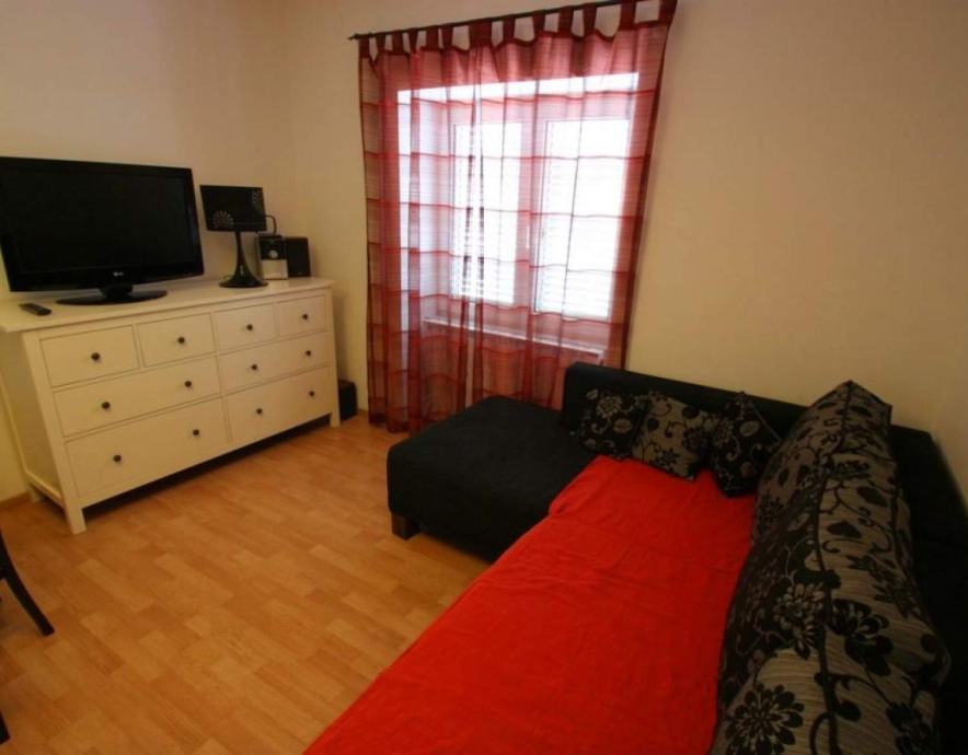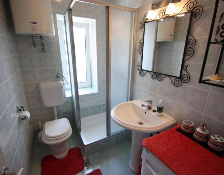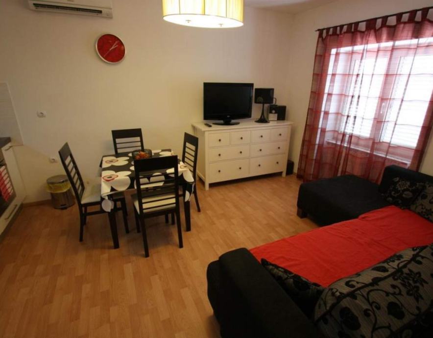 Apartman prvi red do mora kompletno namješten, sastoji se od hodnika, kupaone, dnevni boravak sa blagovanjem i kuhinjom, spavaća soba i natkriveni balkon. Udaljenost od plaže 40 m, konzum 20 m.