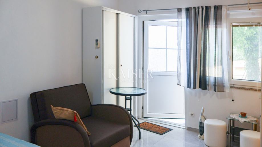Prizemlje je namijenjeno za goste ili za iznajmljivanje, jer se sastoji od studio apartmana i jednog apartmana s jednom velikom spavaćom sobom koje se mogu pregraditi u dvije, oboje s direktnim izlazom na uređenu okućnicu. Zamislite jutarnju kavu ili večernji čaj u ovoj mirnoj oazi, okruženi zelenilom. Moguće je povezati u jedan veliki stan.
