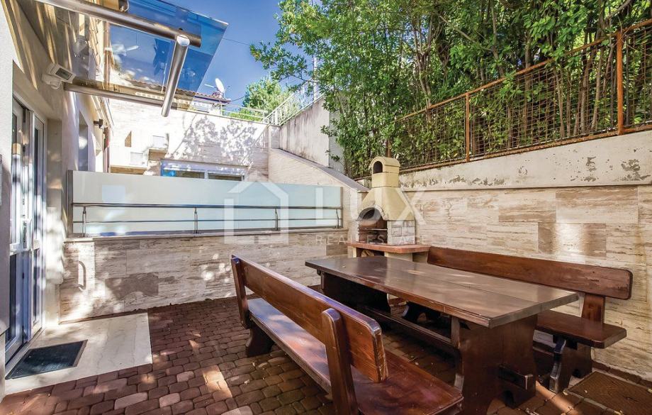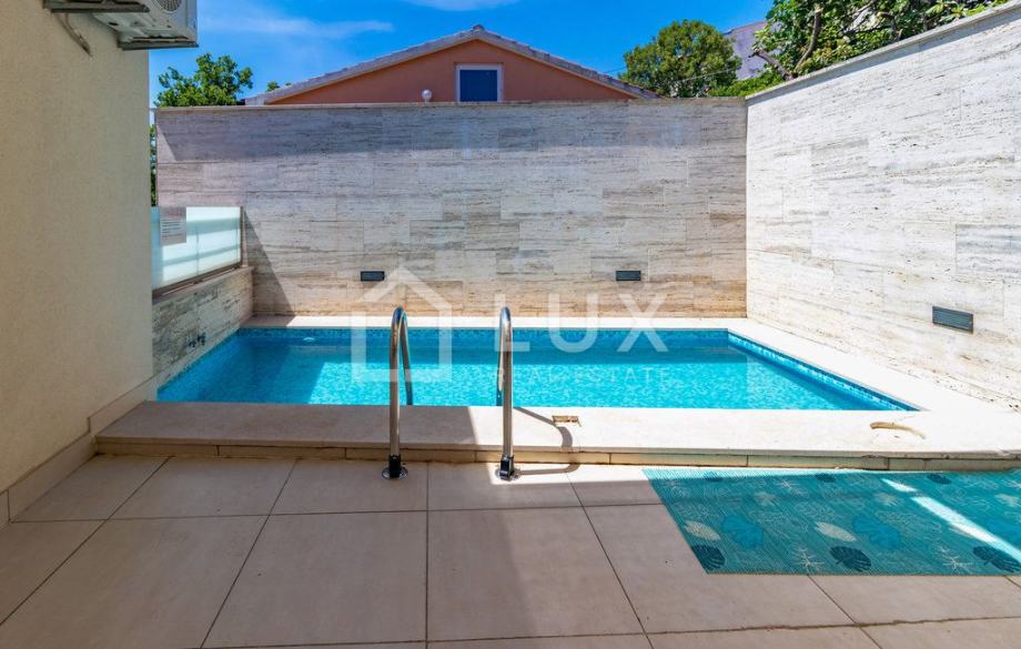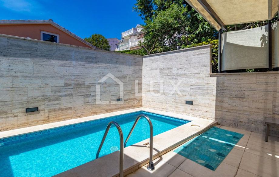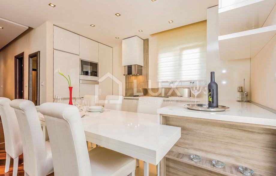 Ovaj apartman pozicioniran je u visokom prizemlju i prostire se na ukupno cca 157 m² korisne površine koja obuhvaća prostrani dnevni prostor s kuhinjom i blagovaonicom, tri elegantno uređene spavaće sobe, prostranu kupaonicu, kao i sve one detalje koje očekujete od nekretnine najviše klase. Iz dnevnog boravka i spavaćih soba jednostavno se izlazi na prostranu terasu i privatnu okućnicu, mjesta koja mame na jutarnju kavu uz zvuk valova i večernje opuštanje uz miris mora.