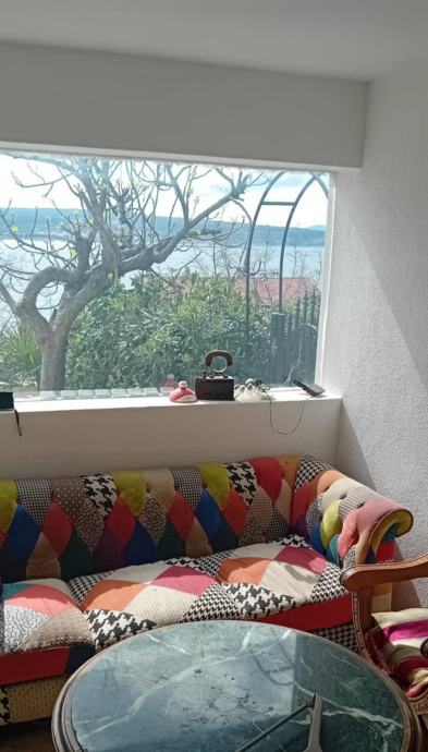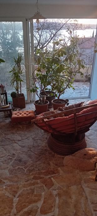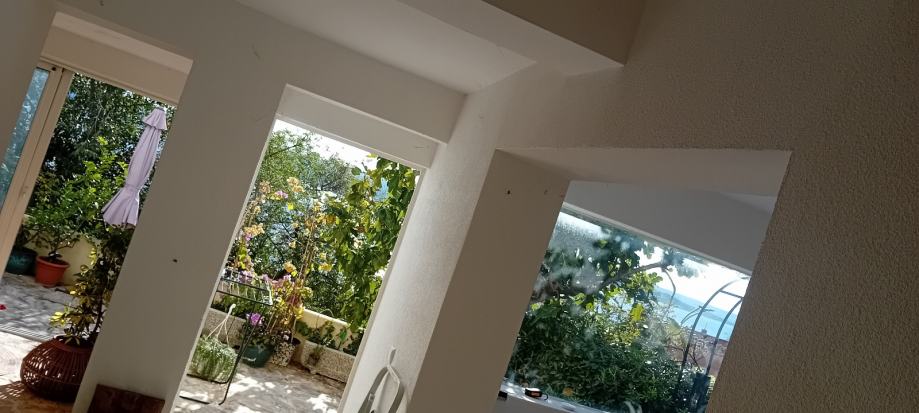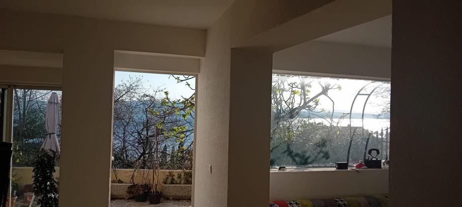 Iz gotovo svih prostorija pruža se izravni pogled na more - cijelom dužinom južne strane (10 dužnih metara) stan u cijelosti ostakljen i kliznim stijenama otvoren na kamenu terasu od 37 m2 te je time ostvarena komunikacija vanjskog i unutarnjeg prostora uz panoramski pogled na more.