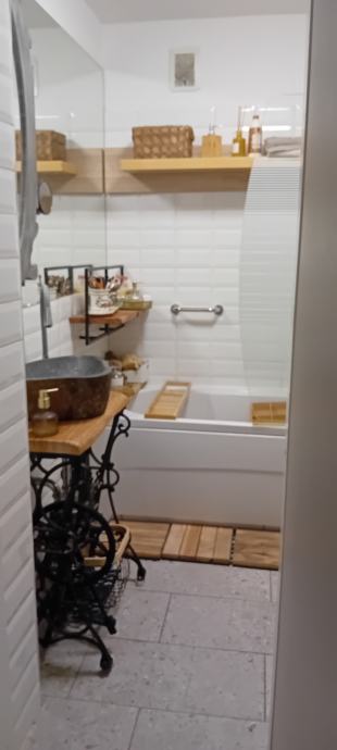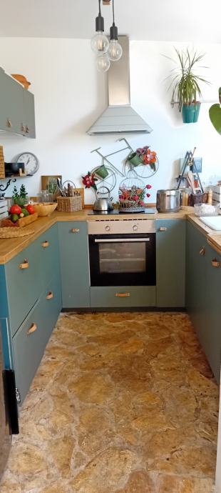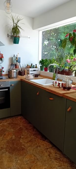 Nova moderna mat sage Ikea kuhinja sa svim uređajima, retrochic kupaonica, soba s walk in garderobom; grijanje mramoterm pločama i novom inverter klimom + dmnjak u funkciji.