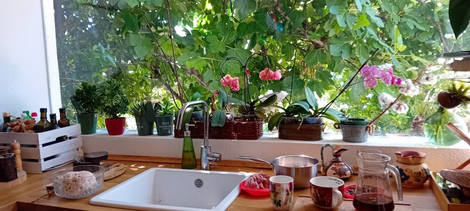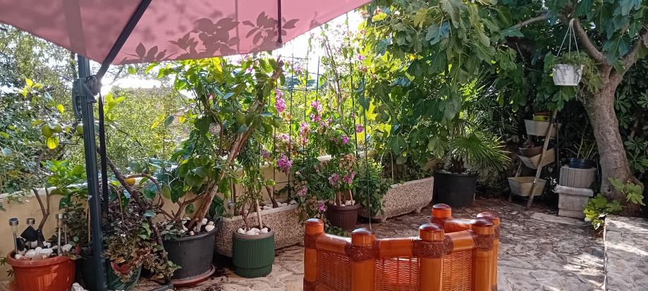 Kamena terasa puna hlada daje mediteranski ugođaj zelene oaze i pruža privatnost zasebnim ulazom te raskošnom vegetacijom - stablima smokvi, palmi, javora, limuna, bugenvilija.