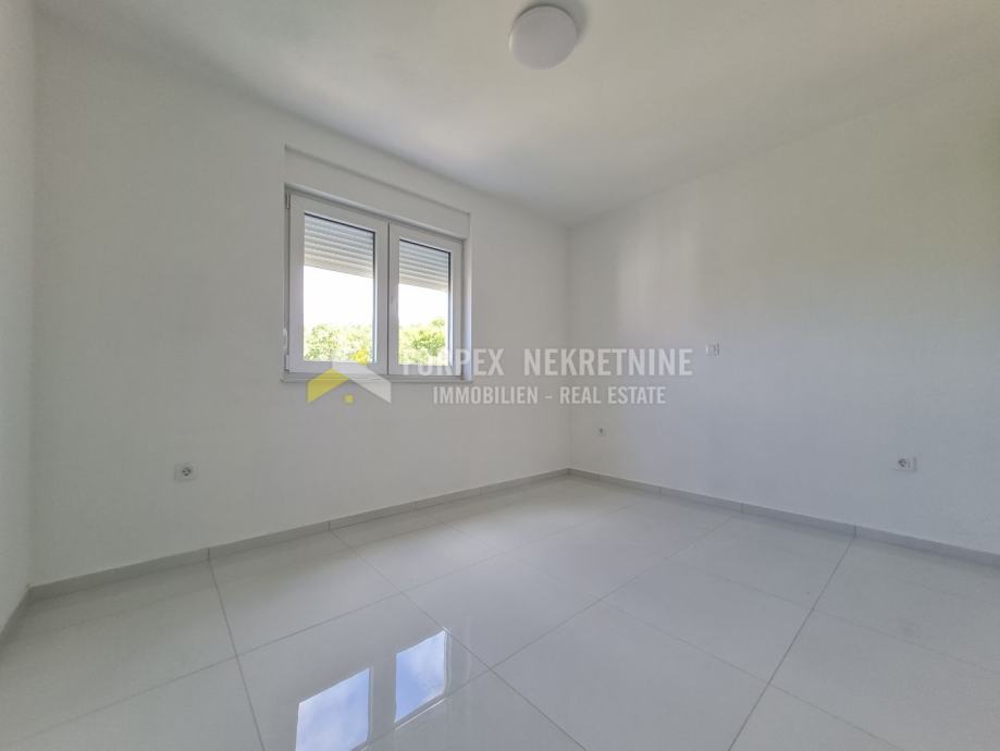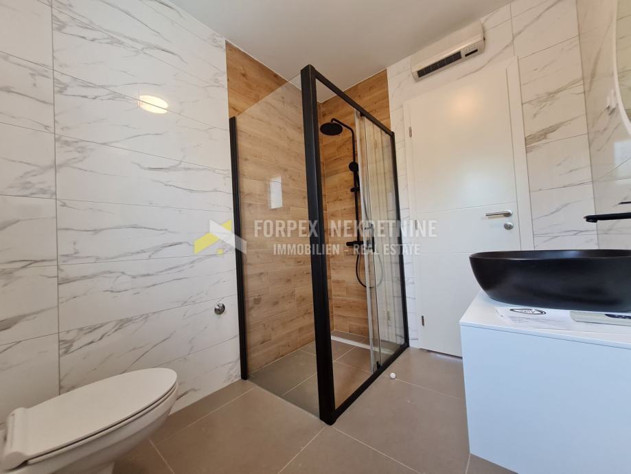 Prodaje se stan u stambenoj zgradi koja se nalazi na mirnoj lokaciji. Stan je veličine 122 m2 te se sastoji od 3 spavaće sobe od kojih jedna ima vlastitu kupaonicu, dnevnog boravka, kuhinje, kupaone, i dvije terase sa prekrasnim pogledom na more. Zgrada je novogradnja, koja je građena prema visokim standardima te su korišteni kvalitetni materijali. Stan je opremljen klima uređajem u svakoj prostoriji, kvalitetnom keramikom, pvc stolarijom sa roletama na elektro motor, protuprovalnim vratima.