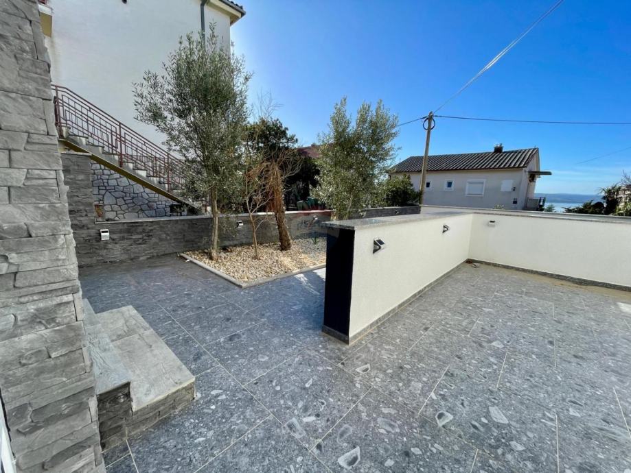 Ispred stana se nalazi prostrana terasa koja je savršena za druženja na otvorenom, uz mali pogled na more.