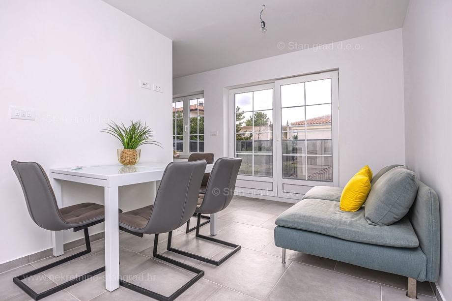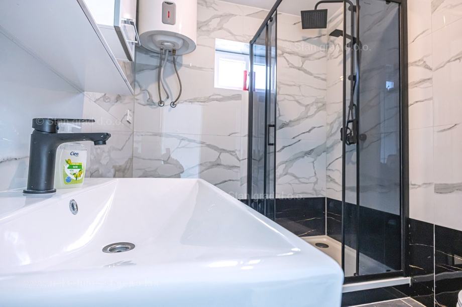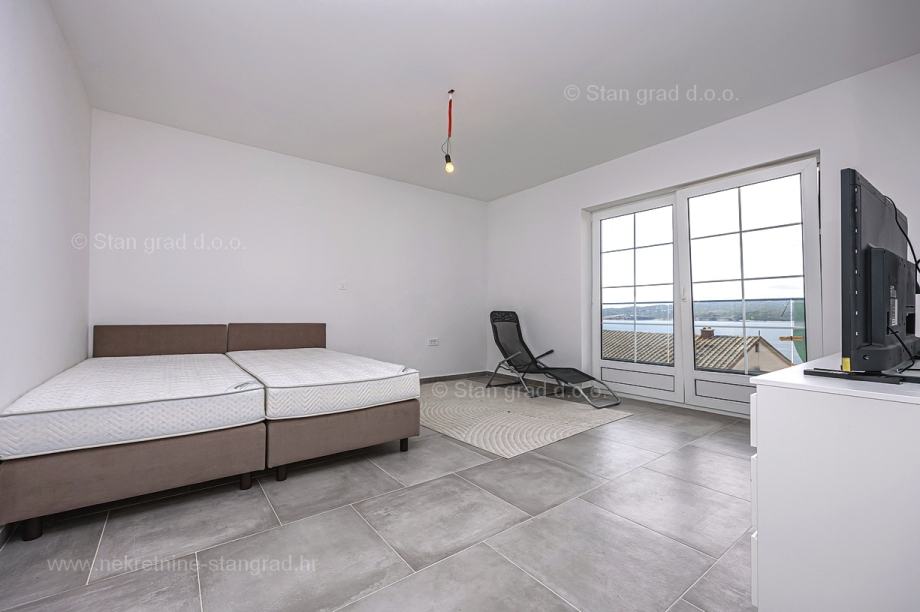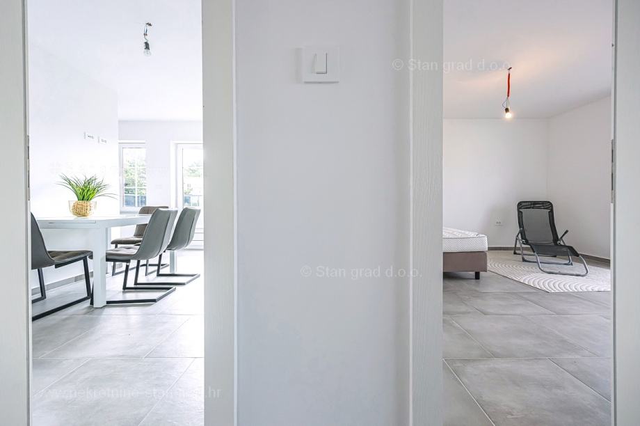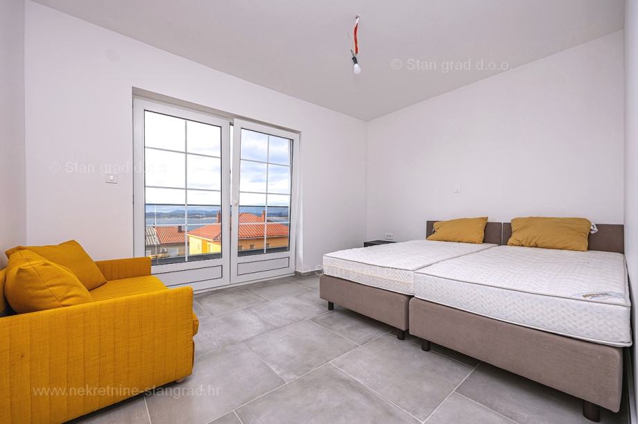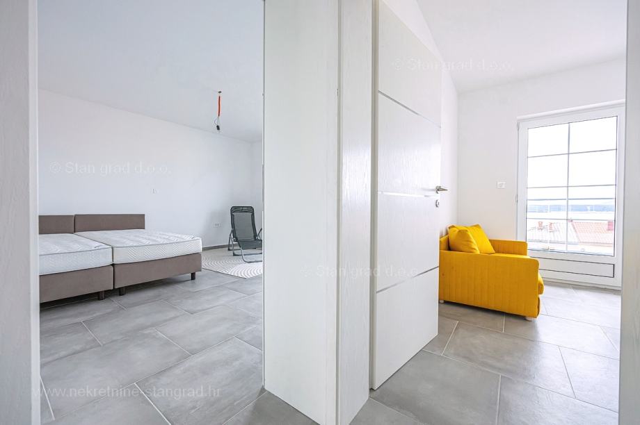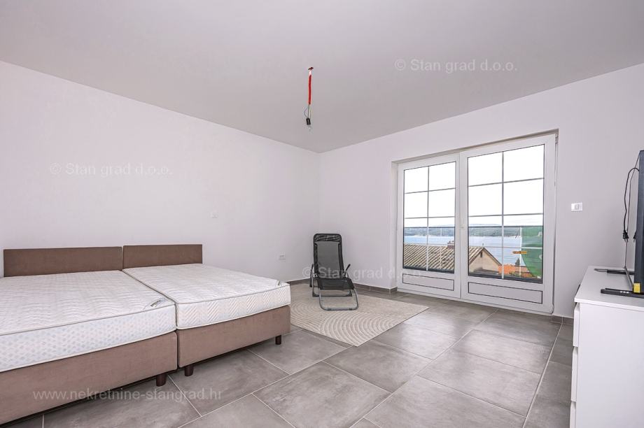 U vrlo dobrom i kvalitetnom objektu, apartman je smješten na 2. etaži. Apartman obuhvaća ukupnu površinu od približno 63 m2. Ovom površinom su obuhvaćeni dnevni boravak i kuhinja, 2 spavaće sobe, kupaonica i lođa. Nekretnina je u svojoj unutrašnjosti kompletno očišćena te prazna i oslobođena od ranije korištenog namještaja. Za napomenuti je svakako i to da opisanom apartmanu pripada komadić dvorišta. Vlasnik apartmana na raspolaganju će imati jedno parkirno mjesto. Uz ranije značajke, objekt je odlično orijentiran, tako da se iz apartmana nudi krasan pogled na more i priobalje. Moguća je zamjena za drugu nekretninu (kuću).