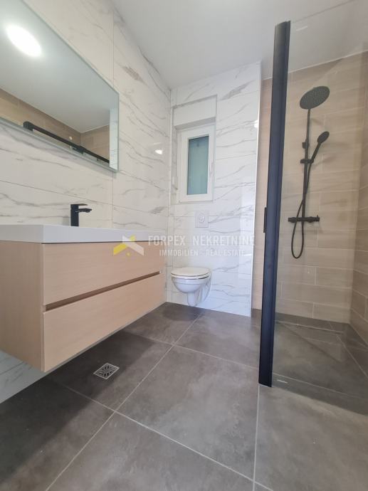 U Crikvenici na udaljenosti 350 metara od mora, prodaje se stan površine 64 m2. Stan se nalazi u novoizgrađenoj zgradi na prvom katu. Sastoji se od dvije spavaće sobe, kuhinje sa blagavaonom, kupaonice, dnevnog boravka i natkrvene terase sa pogledom na more. Stan je južne orijenatacije te ima dovoljno svjetlosti i pogled prema otoku Krku što pruža dodatni ugođaj. Prilikom gradnje korišteni su kvalitetni materijali poput keramike, sanitarija, unutarnje stolarije, pvc prozora. Opremljen je klima uređajem za grijanje i hlađenje. Stanu pripada jedno parkirno mjesto unutar okućnice, a nudi se i mogućnost kupnje garažnog prostora. U suterenu zgrade nalazi se prstor za ostavu površine 3 m2 koji pripada stanu. Zgrada se nalazi u blizini svih potrebnih sadržaja, što ovu nekretninu čini idelanom za ljetni odmor ili duži boravak.