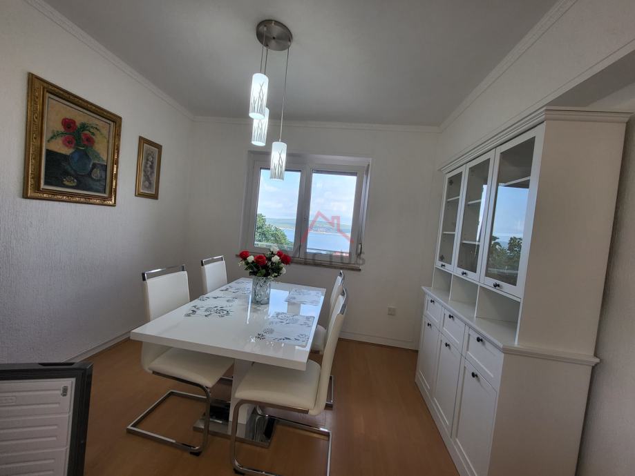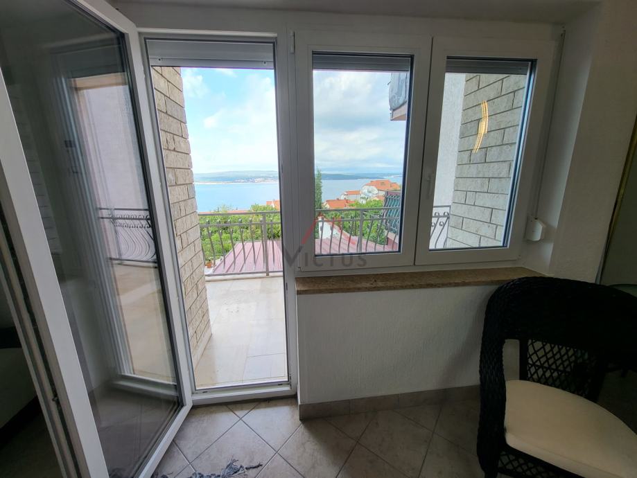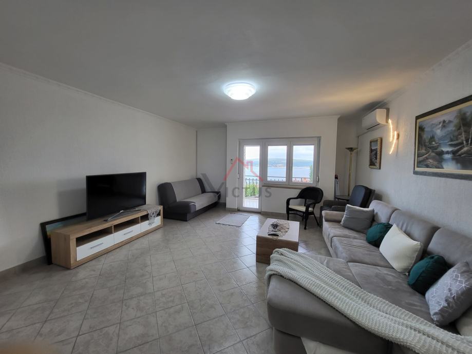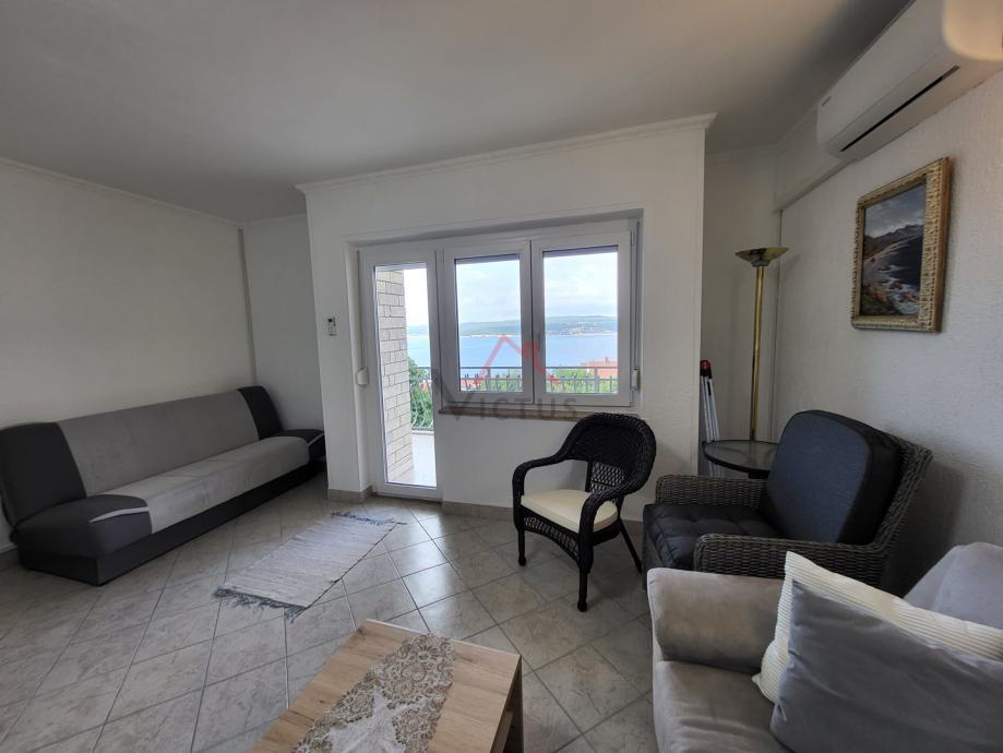 Komforan stan u manjoj zgradi od tri etažna stana, koji se sastoji od hodnika, kupaone, kuhinje, blagovaone, sobe, prostranog dnevnog boravka sa balkonom s kojeg se pruža lijepi pogled na more i otok Krk. Stan je kompletno uređen i namješten i nema potrebnih ulaganja te je kao takav spreman za nove vlasnike.