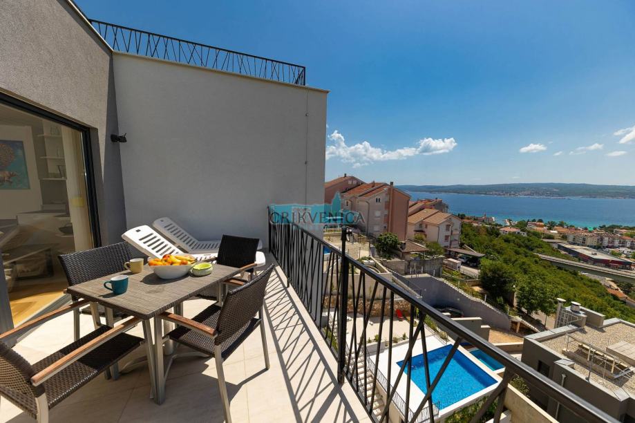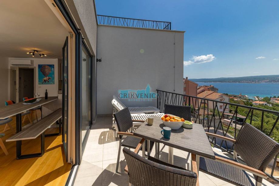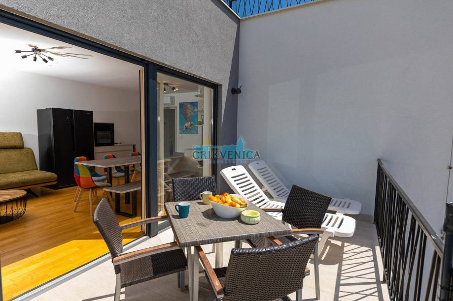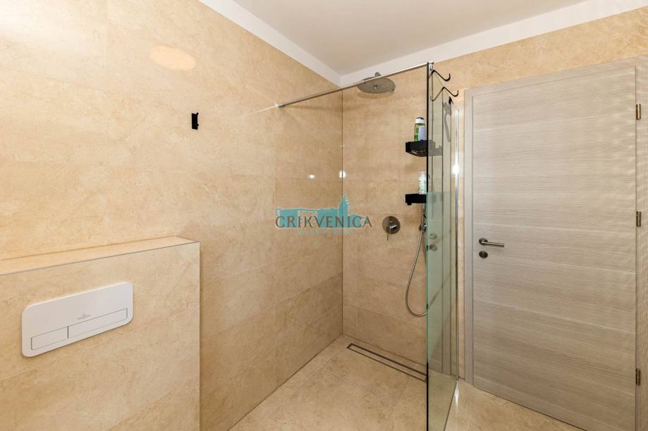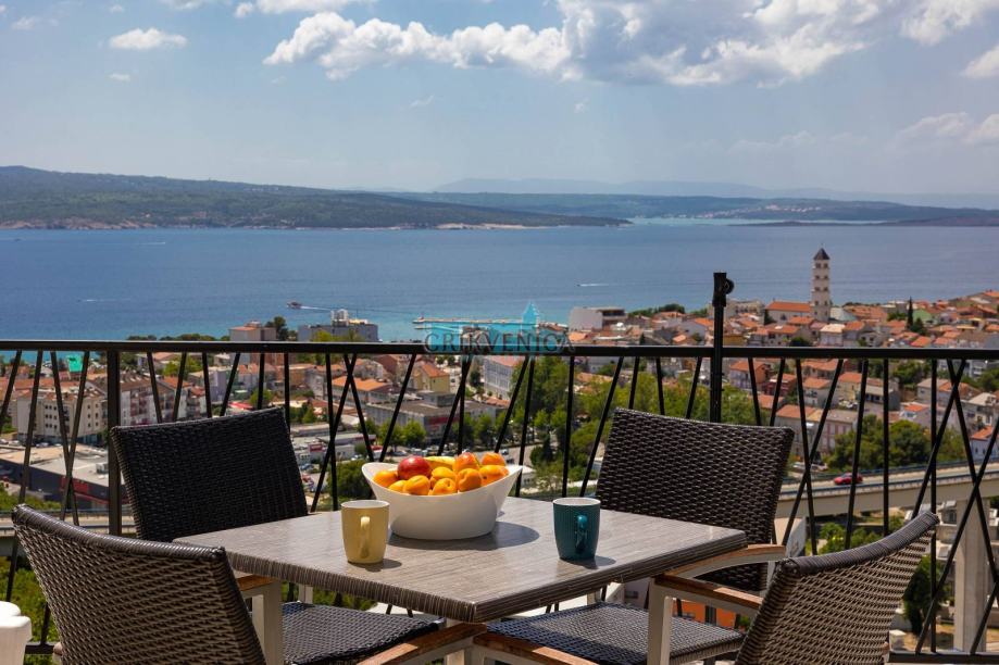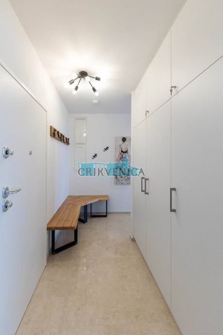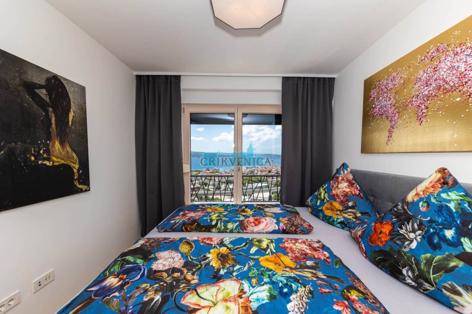 Stan sadrži: tri spavaće sobe, kuhinju sa blagovaonom i dnevnim boravkom s izlazom na terasu, hodnik sa ugradbenim ormarima, kupaonu i još jedan odvojeni wc, krovnu terasu od 150m2 koja pripada samo ovom stanu s koje se pruža pogled na more i grad.
