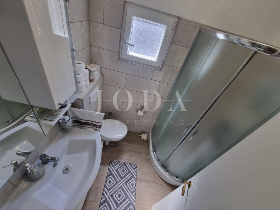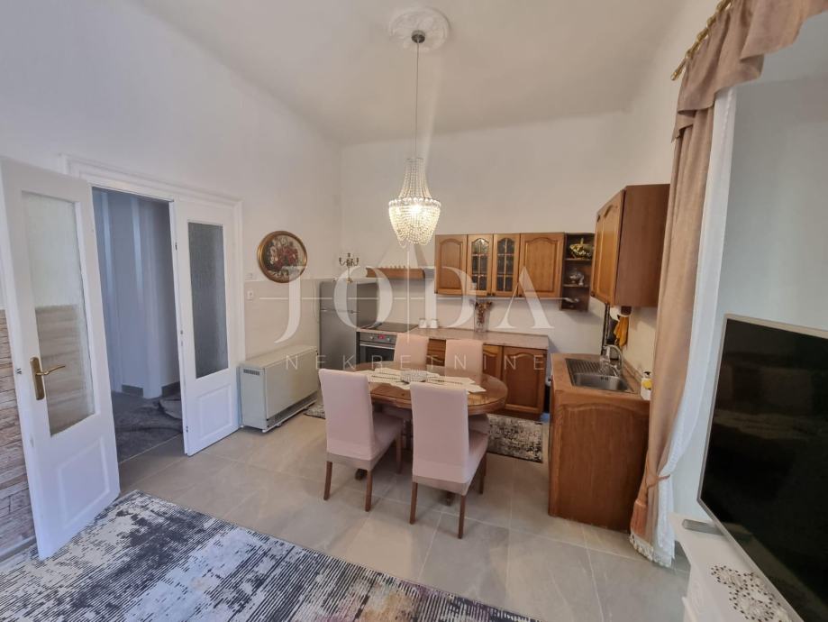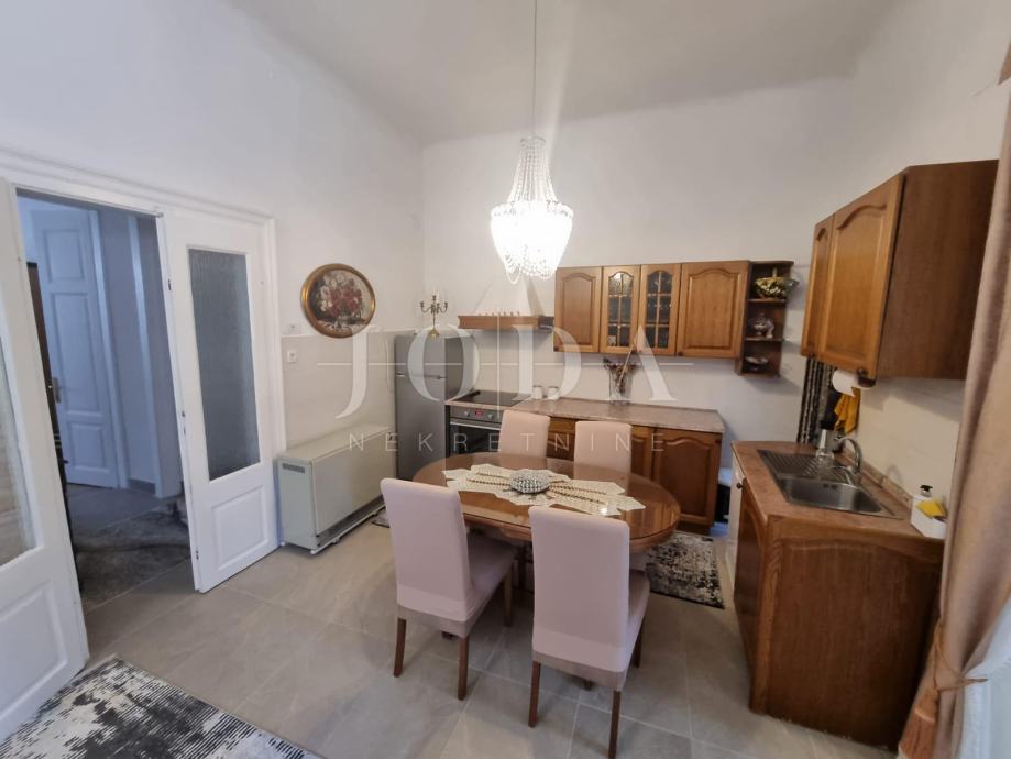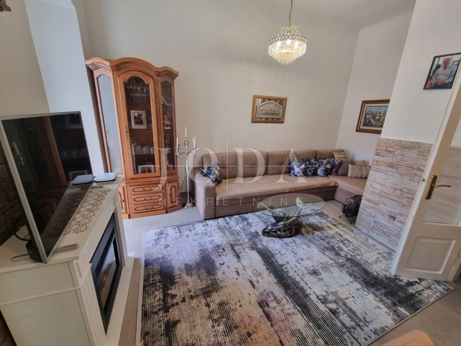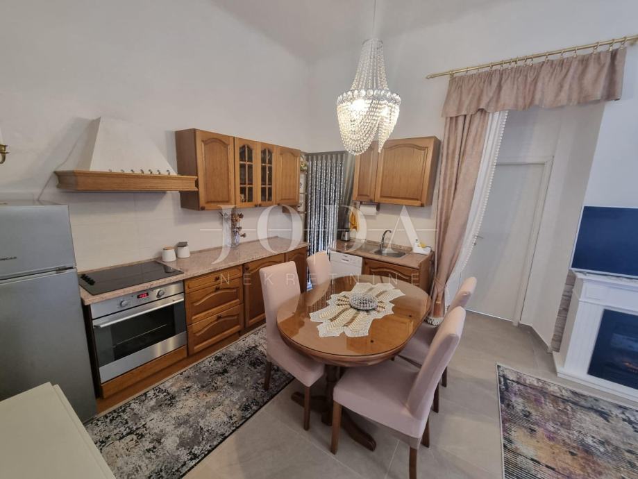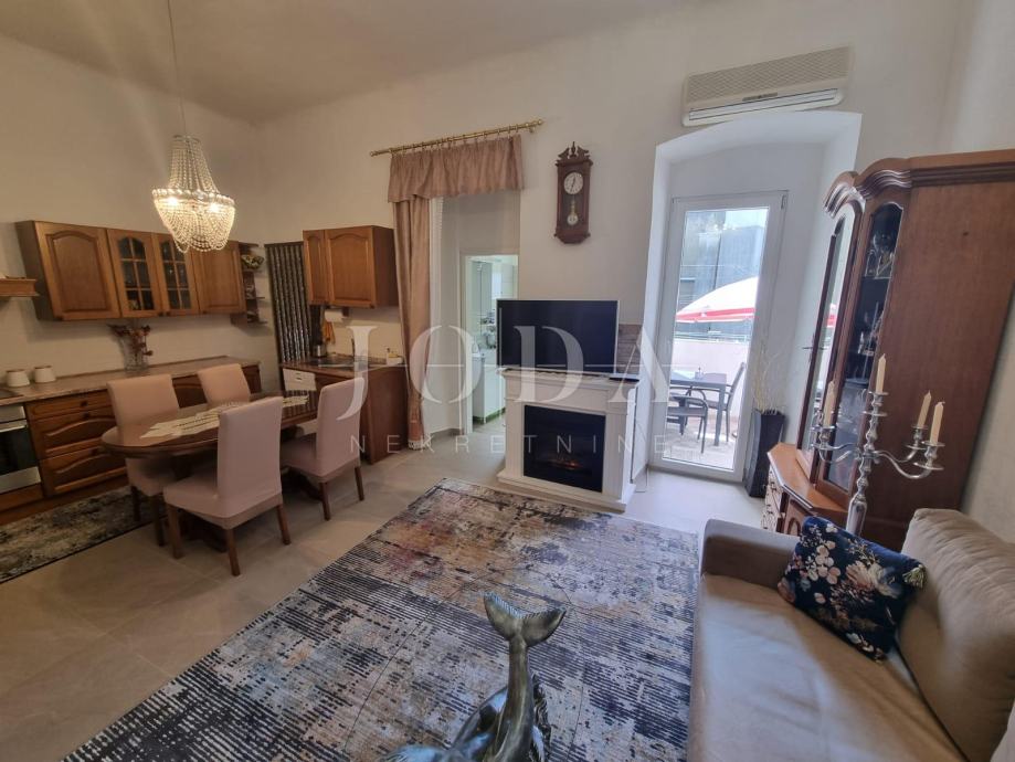 Gospodski stan u centru grada, nalazi se na prvom katu. Stambene površine 83.24 m2, a sastoji se od dnevnog boravka s kuhinjom, dvije spavaće sobe, balkona, hodnika i kupaonice. Adaptiran i uredan, odmah useljiv. Odlična lokacija, na 50 m od prve plaže.