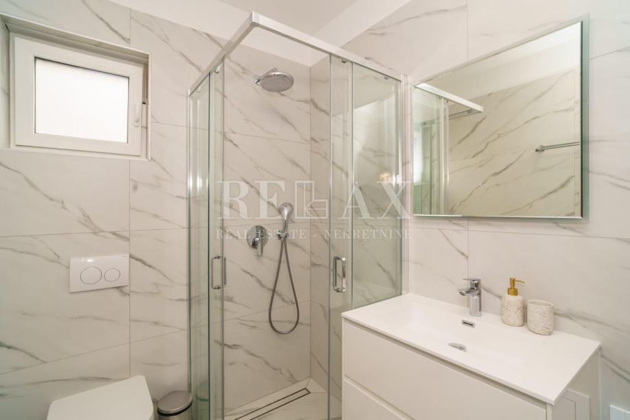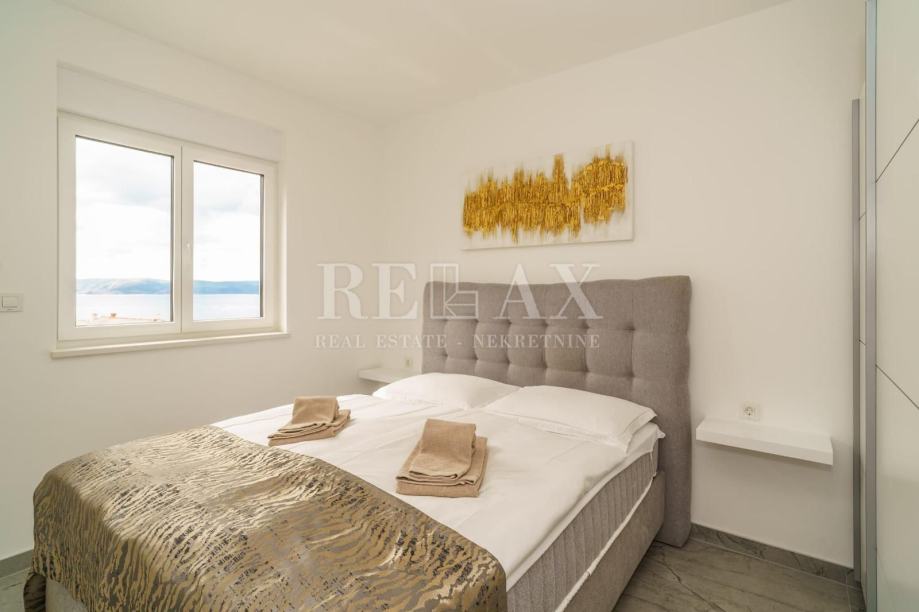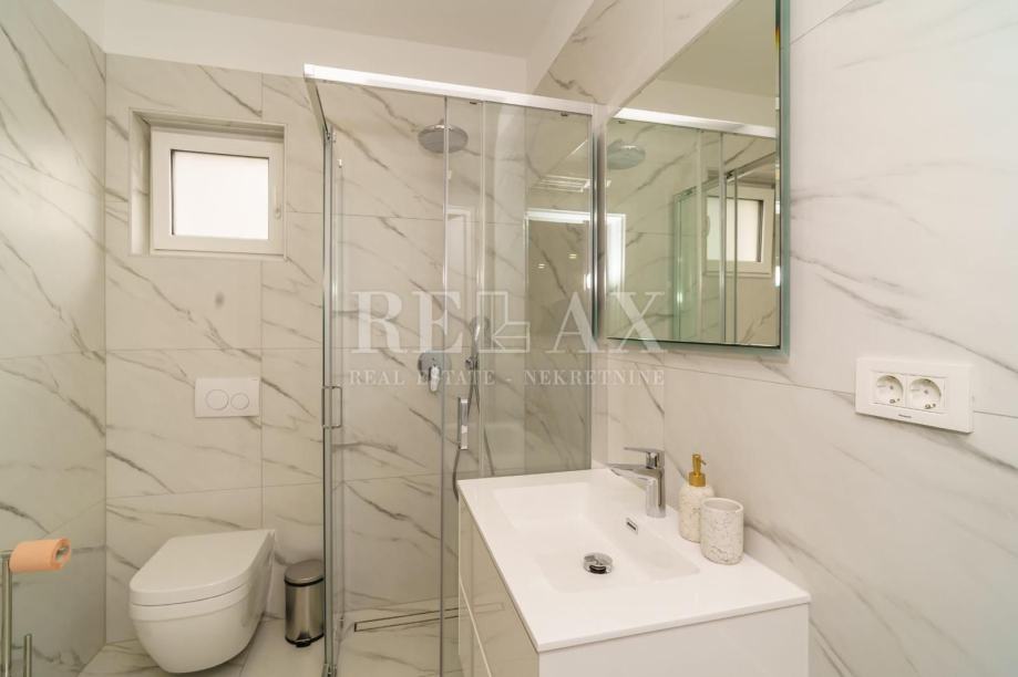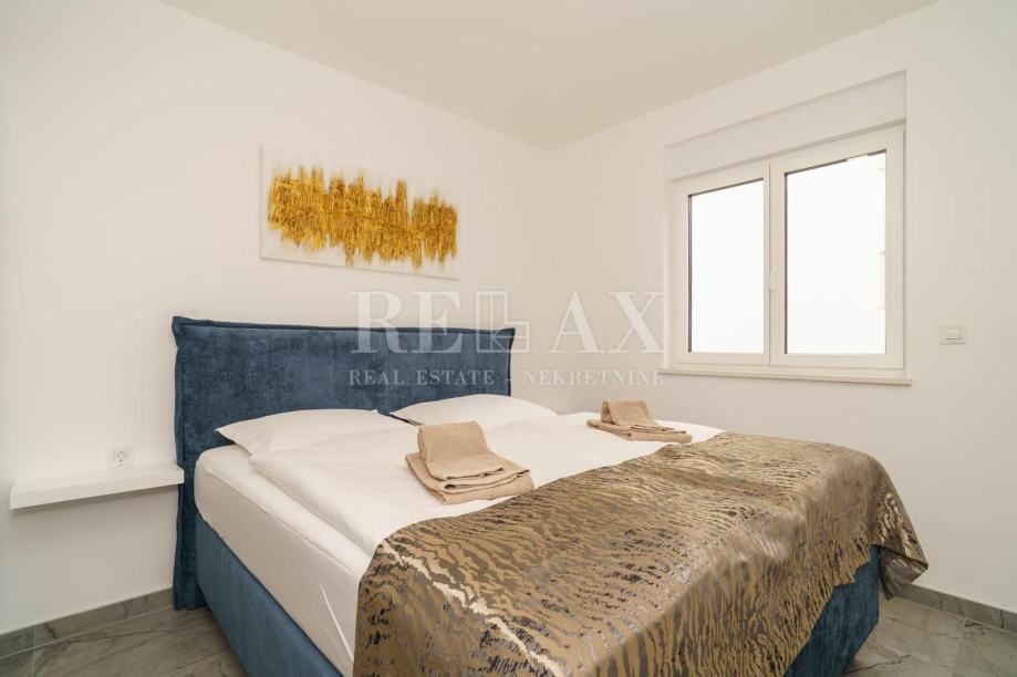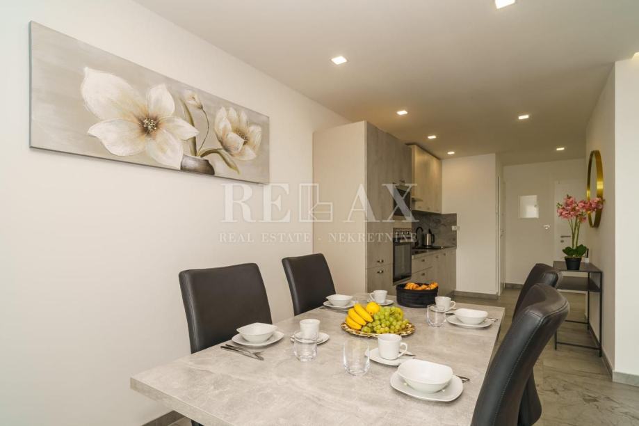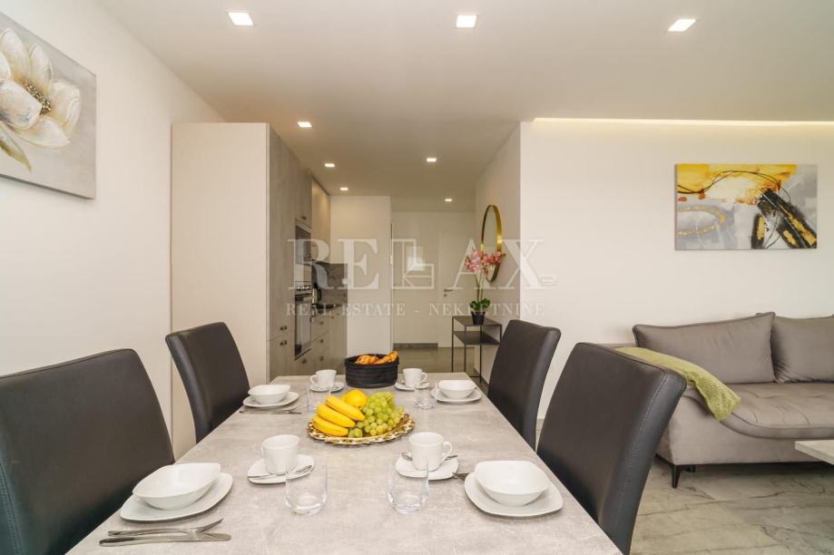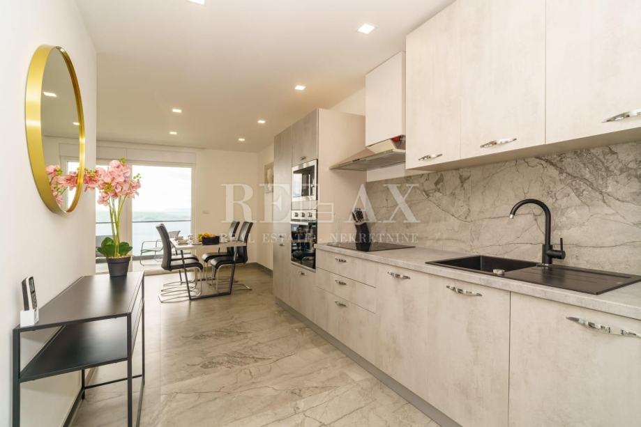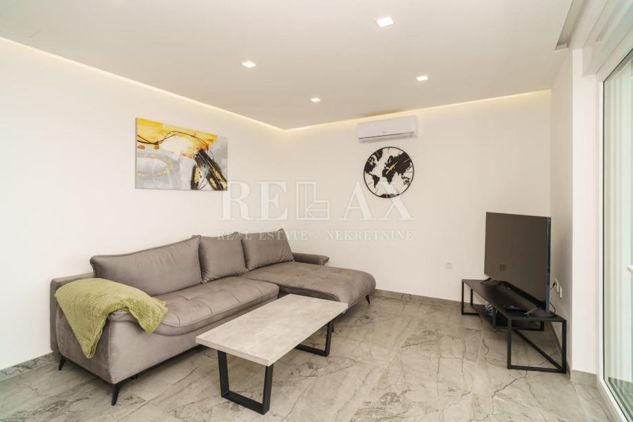 Udobnost stanovanja dodatno je osigurana podnim grijanjem te klima uređajem, čime je boravak u prostoru ugodan tijekom cijele godine, bez obzira na sezonu. Velike staklene stijene u dnevnom prostoru vode prema natkrivenoj terasi idealnoj za opuštanje i uživanje u pogledu na more.