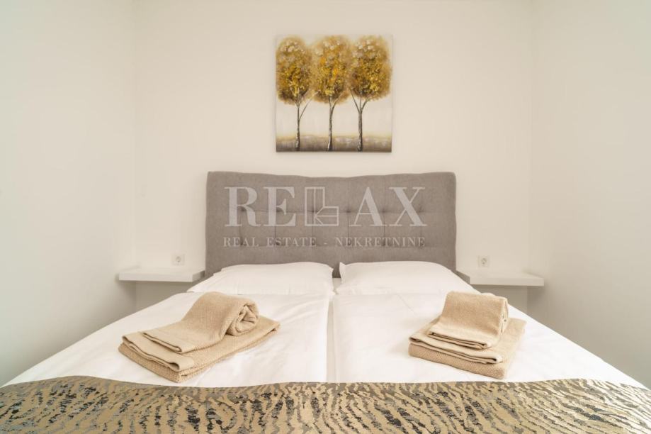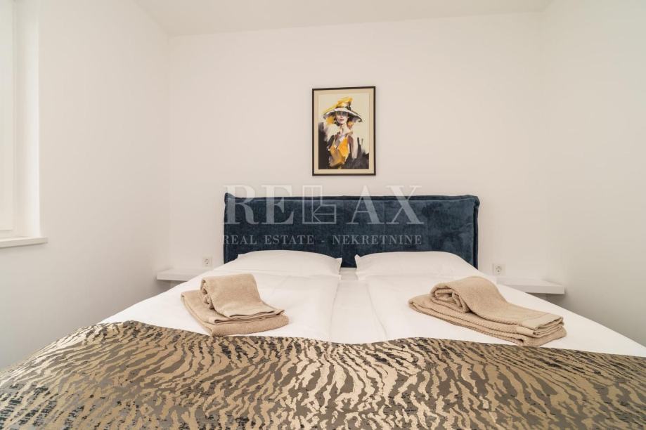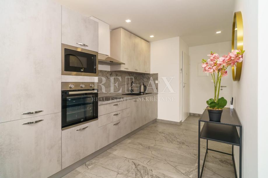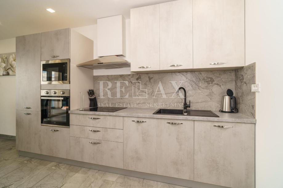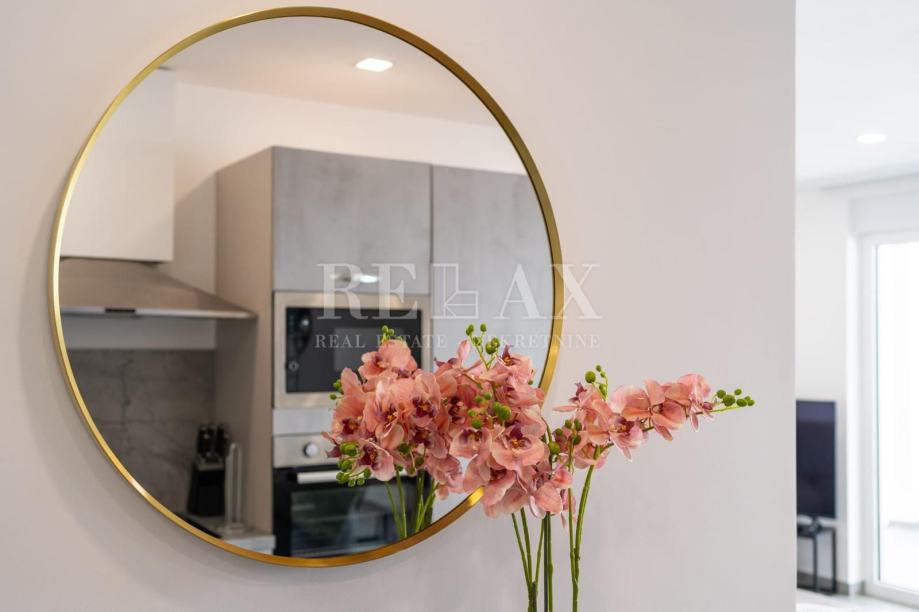 Unutrašnjost stana pažljivo je uređena te se sastoji od dnevnog boravka povezanog s blagovaonicom i kuhinjom u otvorenom konceptu, dvije spavaće sobe, kupaonice i hodnika. Stan se prodaje potpuno namješten, s pažljivo odabranim detaljima i kvalitetnim materijalima, što omogućuje useljenje bez dodatnih ulaganja.