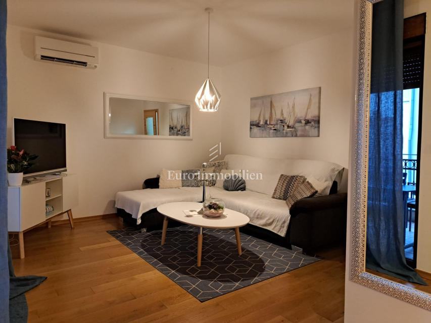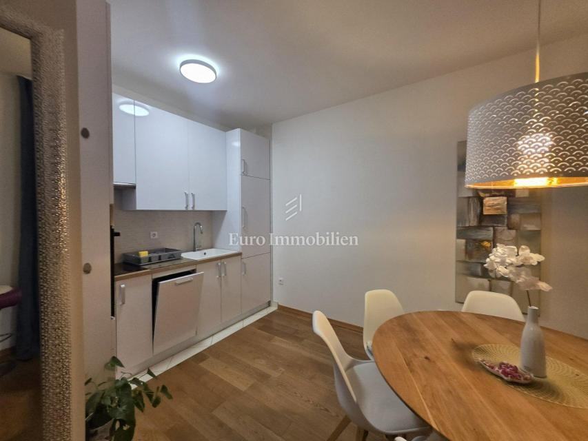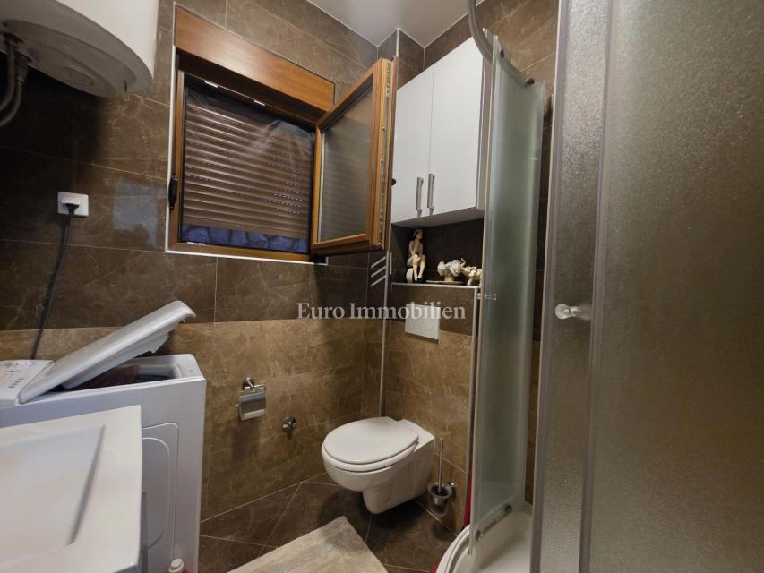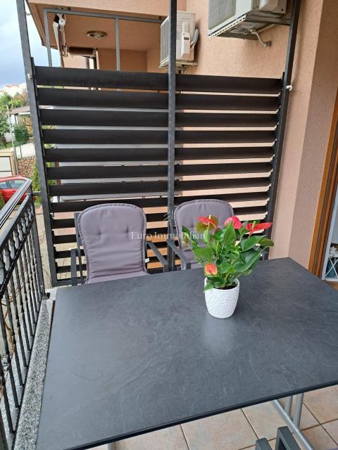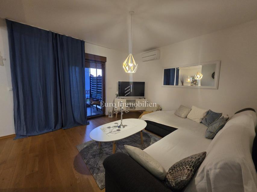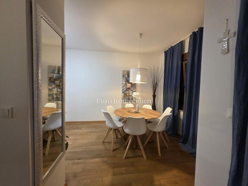 Stan je opremljen novim, modernim namještajem. Postavljena je kvalitetna PVC stolarija s roletama, a na balkonu je tenda koja pruža osjećaj ugode kroz cijeli dan.