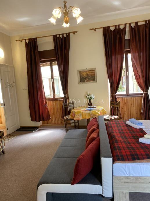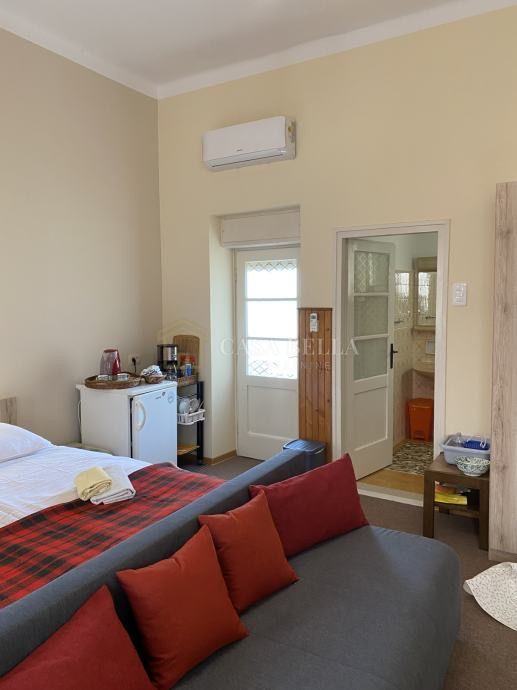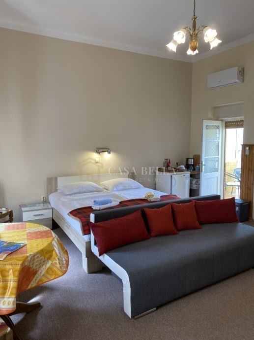 Kuća se sastoji od prizemlja s apartmanom za dvoje, prvog kata s trokrevetnom spavaćom sobom i balkonom te kupaonicom, drugog kata s spavaćom sobom i balkonom, te potkrovlja s još jednom spavaćom sobom i balkonom s pogledom na more. Sve jedinice su potpuno odvojene i samostalne za iznajmljivanje, s pristupom preko zajedničkog stubišta. Ova nekretnina, s 3 zvjezdice, već ima dugogodišnju turističku tradiciju i pruža klimatizirane sobe, SAT-TV, internet, frižider i sef. S obzirom na svoj prostor, postoji veliki potencijal za adaptaciju u studio apartmane, pružajući priliku za investiciju u turizam. Odlična lokacija na par koraka do trga, plaža, trgovina, hotela i restorana čini ovu kuću izvrsnim izborom za turistički najam.