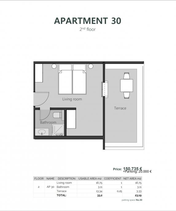 Apartman AP30 sastoji se od otvorenog dnevnog prostora koji objedinjuje boravak i spavaći dio, kupaonice te prostrane terase, a ukupna neto površina iznosi 23,19 m². Smješten je na drugom katu potpuno renoviranog objekta hotelskog tipa u Crikvenici. Upravo terasa daje ovom apartmanu dodatnu vrijednost, kako u svakodnevnom korištenju, tako i u kontekstu turističkog najma.
