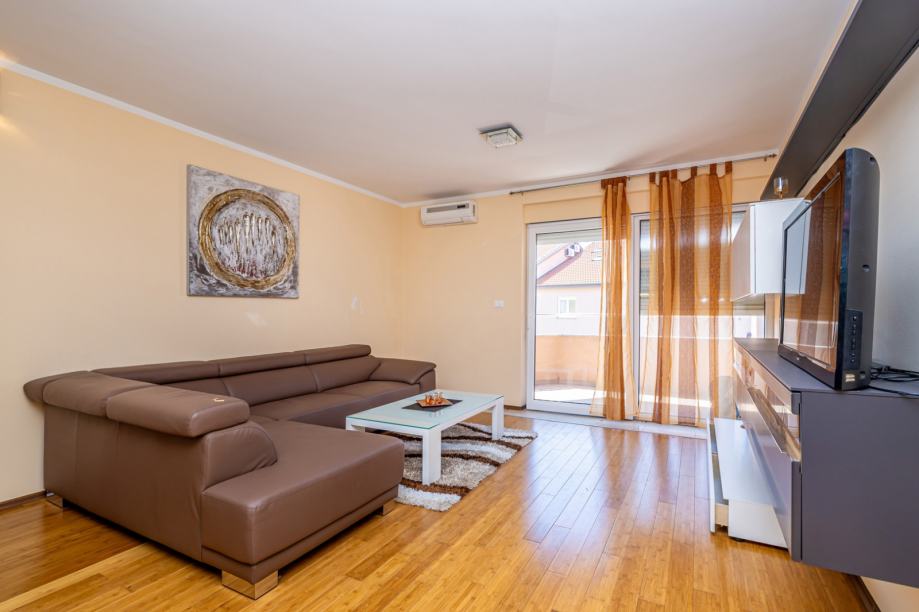 Stan se sastoji od tri spavaće sobe, dvije kupaonice, dodatnog WC-a, kuhinje s blagovaonicom te prostranog dnevnog boravka koji ima izlaz na balkon. Apartman raspolaže s dva balkona, od kojih se pruža lijepi pogled na more.