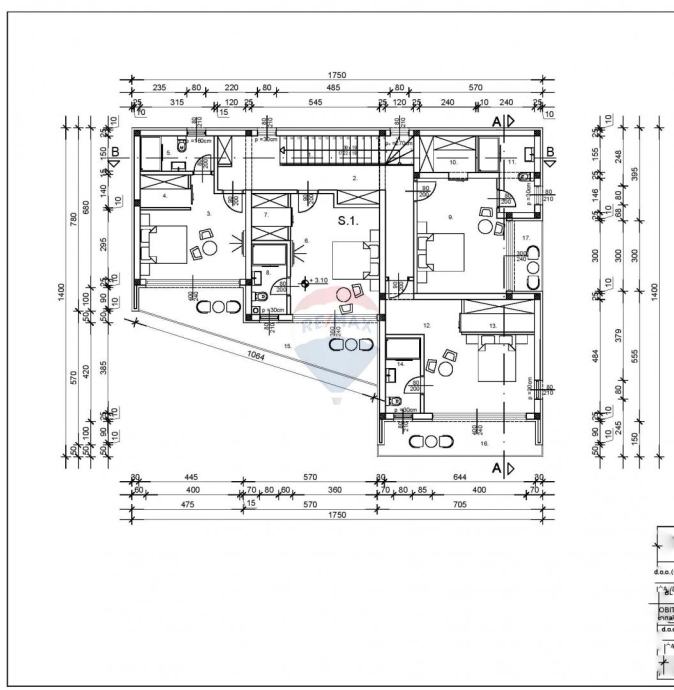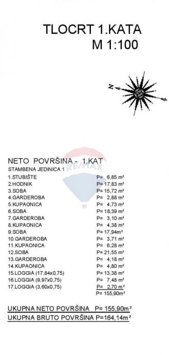 Unutarnjim stubištem ide se na 1.kat vile gdje se nalazi hodnik, 4 spavaće sobe sa kupaonom i garderobom, od kojih 3 spavaće sobe imaju izlaz na loggiu, sa kojih se pruža prekrasan pogled na more.