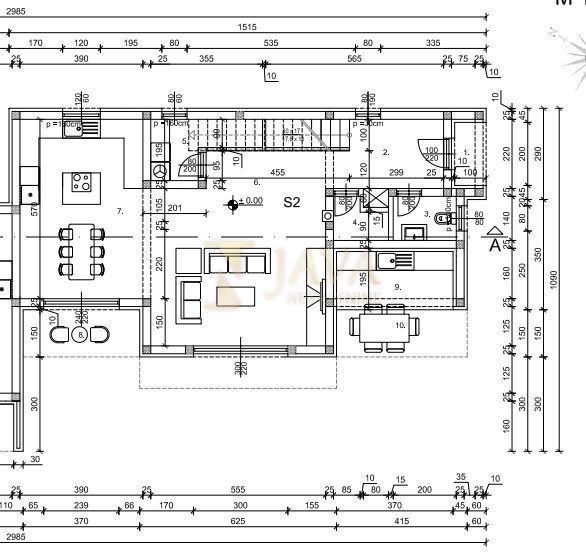 * Prizemlje: natkriveni ulaz, hodnik, open space kuhinja s blagovaonicom i dnevnim boravkom, WC za goste, vešeraj, spremište i stubište za gornji kat