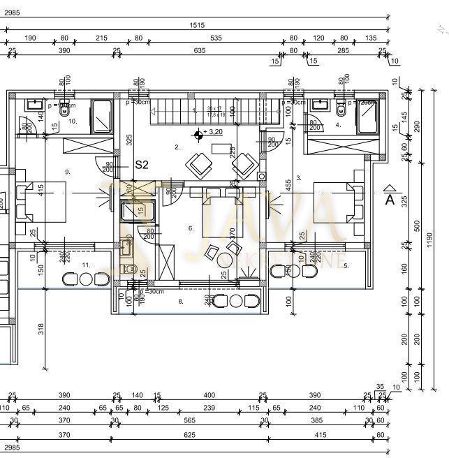 * 1.kat: tri spavaće sobe s vlastitim kupaonicama i izlazima na lođu, predsoblje