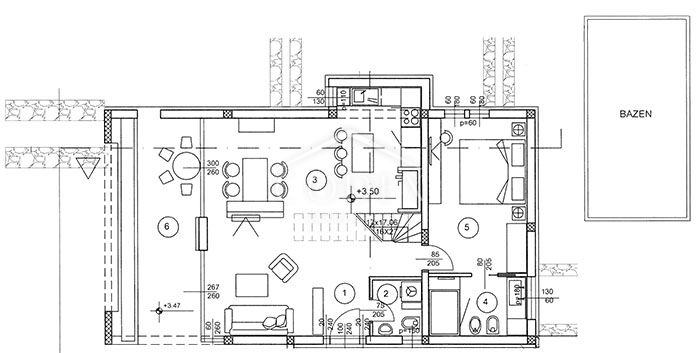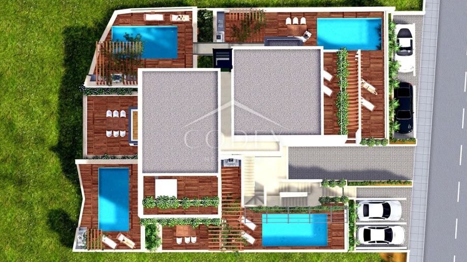 U objektu se nalaze četiri stambene jedinice, od kojih su dvije jednoetažne u prizemlju, a dvije dvoetažne na 1. i 2. katu. Svaka stambena jedinica osigurava potpunu privatnost, privatni bazen, te vanjsko i garažno parkirno mjesto, uz dodatne prostore kao što su spremište i kotlovnica. Pristup gornjim etažama omogućen je zajedničkim stepeništem ili liftom.