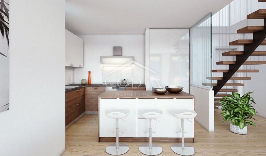 Dvoetažni stan od oko 100 m² također ima zaseban ulaz, privatni bazen te dvije natkrivene terase s pogledom na more i okolne otoke i planine.
