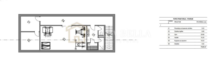 U podrumu su predviđeni teretana, prostor za bazensku tehniku, dizalica topline te sauna.