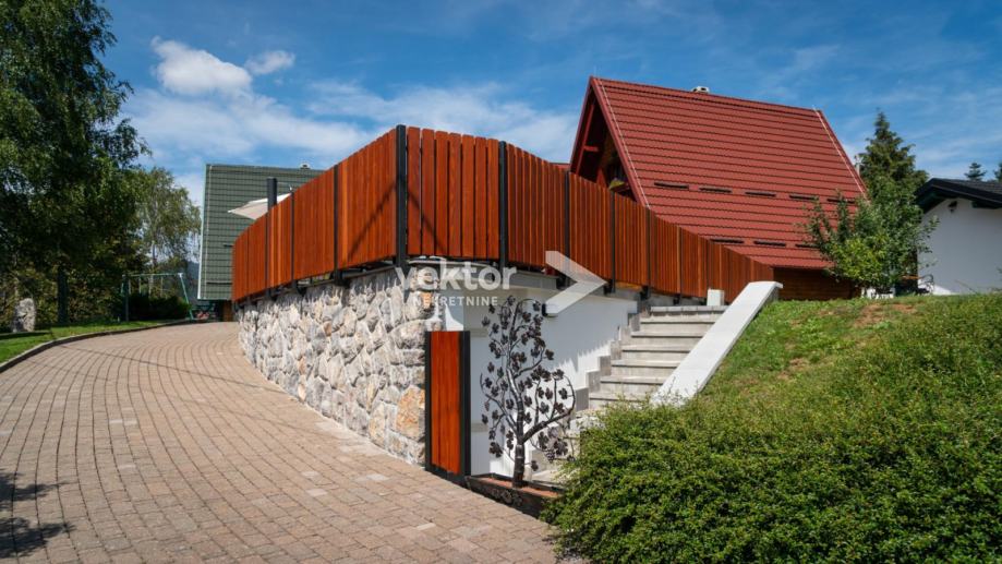 Okućnica je uređena do zadnjeg detalja, na njoj se nalazi dječje igralište, natkriveni jacuzzi i grijani bazen. Na parceli se nalazi i dodatni objekt u kojem je konoba s roštiljem i stol za 16 osoba, a u jednom dijelu je smještena sauna. Cijela parcela je ograđena i osigurava intimu.