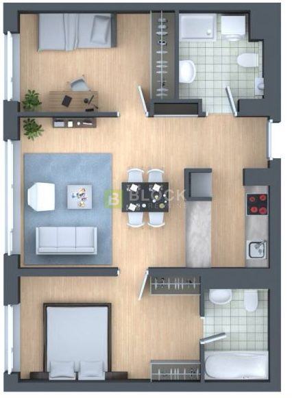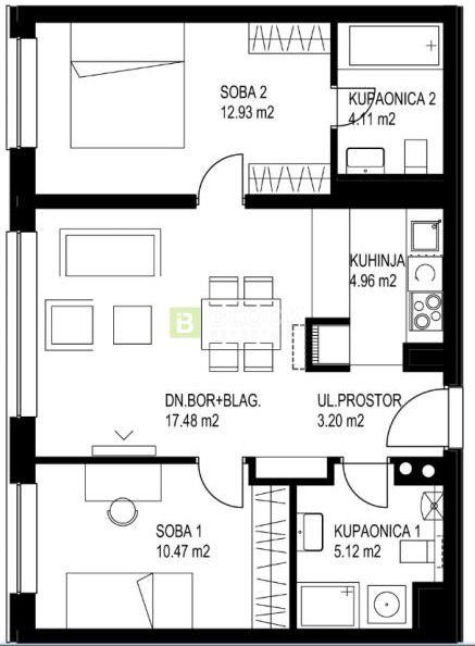 Stan se nalazi na četvrtom katu stambeno-poslovnog kompleksa i sastoji se od ulaznog prostora, velikog dnevnog boravka i blagavaone, potpuno, moderno opremljene kuhinje, dvije spavaće sobe, dvije kupaone( jedna kupaona u sklopu spavaće sobe)
