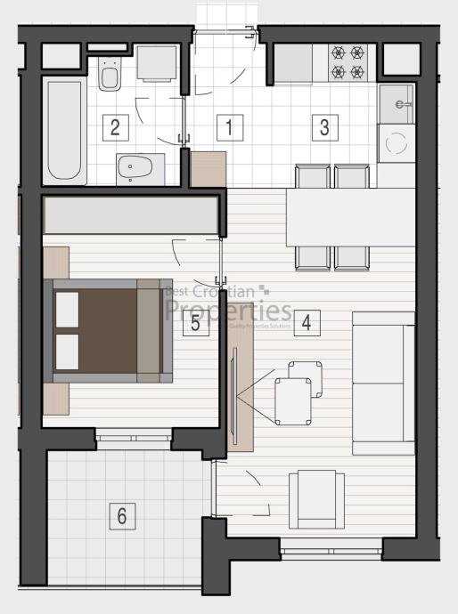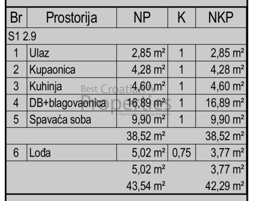 Sami stan ima 42.29m2 i sastoji se od ulaznog prostora (2.85m2), dnevnog boravka sa blagavaonicom (16.89m2), kuhinje (4.60m2) sobe (9.90m2), kupaonice (4.28m2) i loggie od 5.02m2 (5.02m2 x 0.75= 3.77m2).