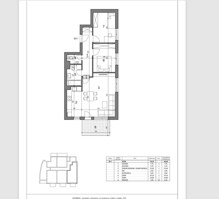 Kuhinja, kupaonica, wc, hodnik, balkon i terasa stana obložene su