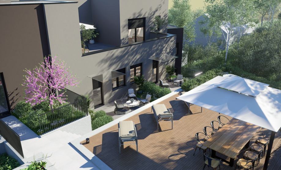 Zgrada je projektirana tako da se iz stanova na različitim etažama izlazi izravno u ograđene zelene vrtove, okružene šumom.