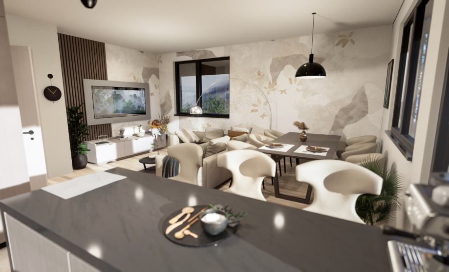 Podovi dnevne i spavaće sobe obložene su troslojni hrastovim parketom prilagođenim za podno grijanje.