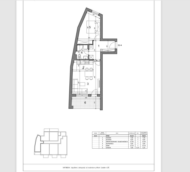 Kuhinja, kupaonica, wc, hodnik, balkon i terasa stana obložene su
