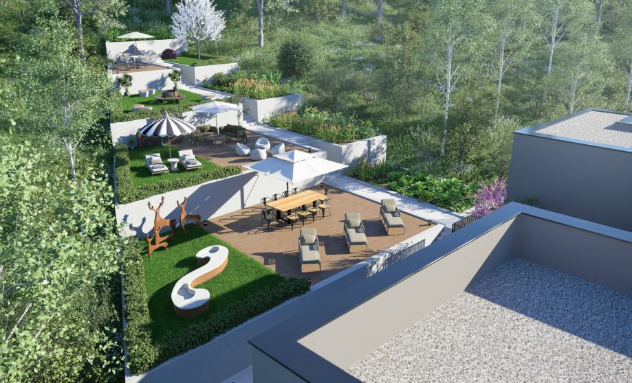 Zgrada je projektirana tako da se iz stanova na različitim etažama izlazi izravno u ograđene zelene vrtove, okružene šumom.