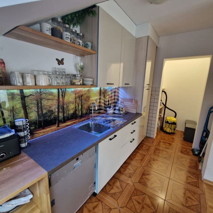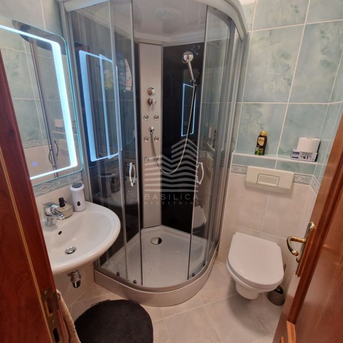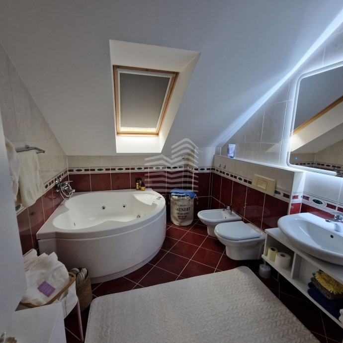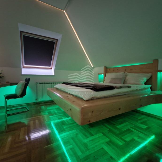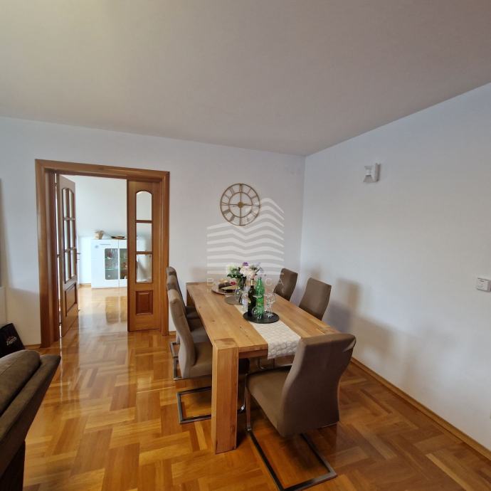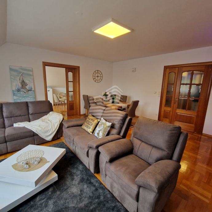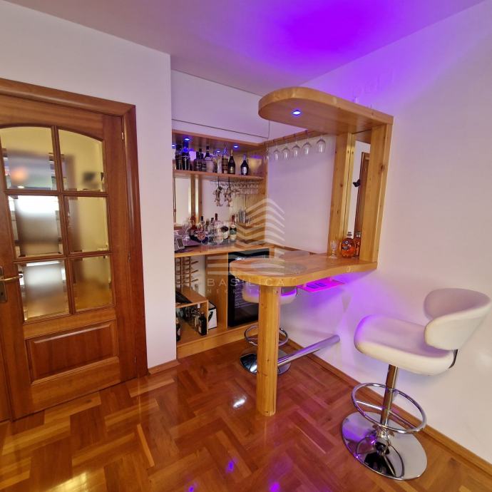 Prodaje se kompletno namješten kvalitetnim namještajem od punog drva (dva lebdeća kreveta - rijetkost na tržištu) i opremljen svim potrebnim uređajima i aparatima (ključ u ruke). Obzirom da je stan samo povremeno korišten, sav namještaj i oprema su u vrhunskom stanju.