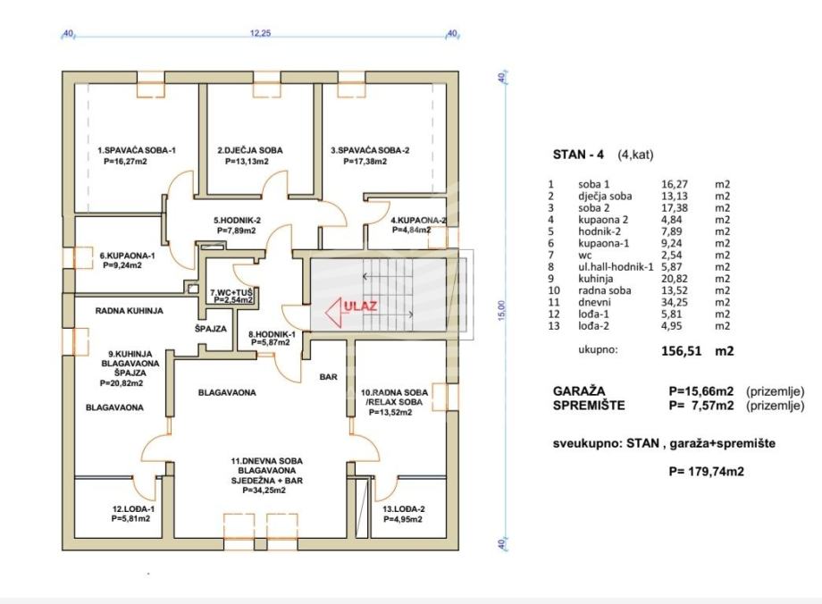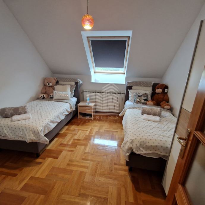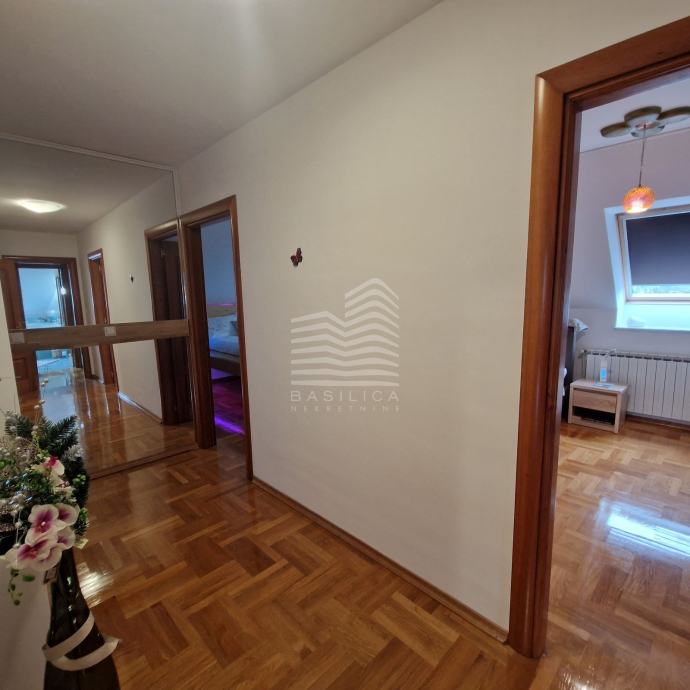 Stan se sastoji od hodnika, četiri sobe (tri spavaće i jedna radna), tri kupaonice, kuhinje s blagovaonicom, velikog dnevnog boravka i dvije loggie, ukupne netto korisne površine 156,51 m2. Stanu pripada i spremište (7,57 m2) i garaža (15,66 m2) u prizemlju zgrade. Mogućnost parkiranja za još 1 vozilo ispred garaže, te besplatan parking u ulici.