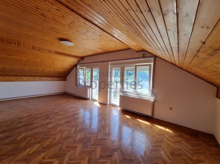 Na drugom katu (visoko potkrovlje) nalazi se dvije prostorije, od kojih je jedna pretvorena u veliku sobu koja se proteže s jednog kraja vanjskog zida kuće do drugog kraja vanjskog zida kuće i izlazi na balkon, te manje sobe, kao i prostorije namijenjena za kupaonicu s wc-om koju treba ugraditi. Kompletna lamperija je uređena i novopofarbana. Iznad je još tavanski prostor.